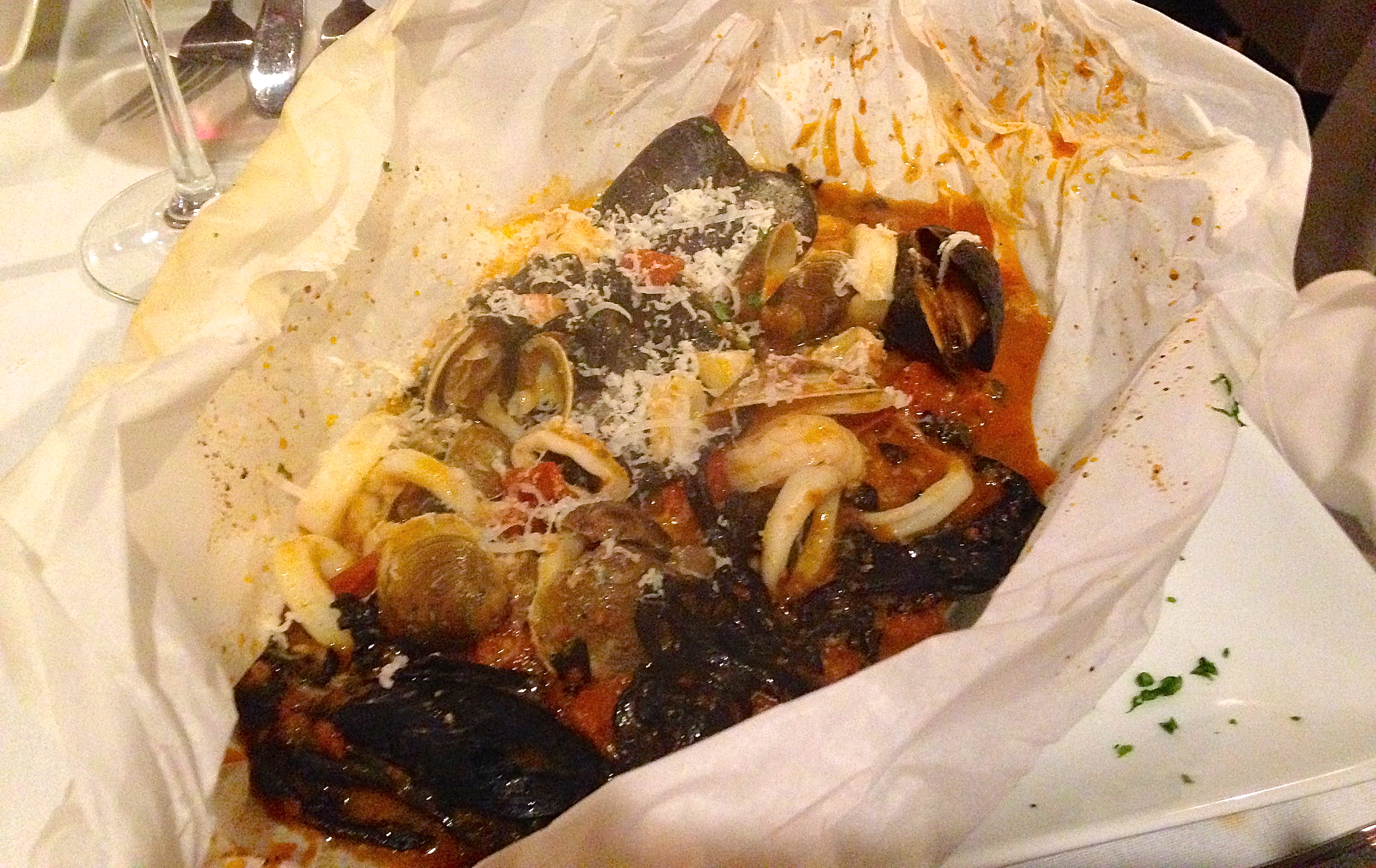 Chef Luigi presents the tagliatelle al cartoccio in parchment paper. Inside is stuffed clams, calamari and black-ink pasta. When it’s opened all of the steam from the hot food comes out. It’s quite the show on the plate and it’s gorgeous.