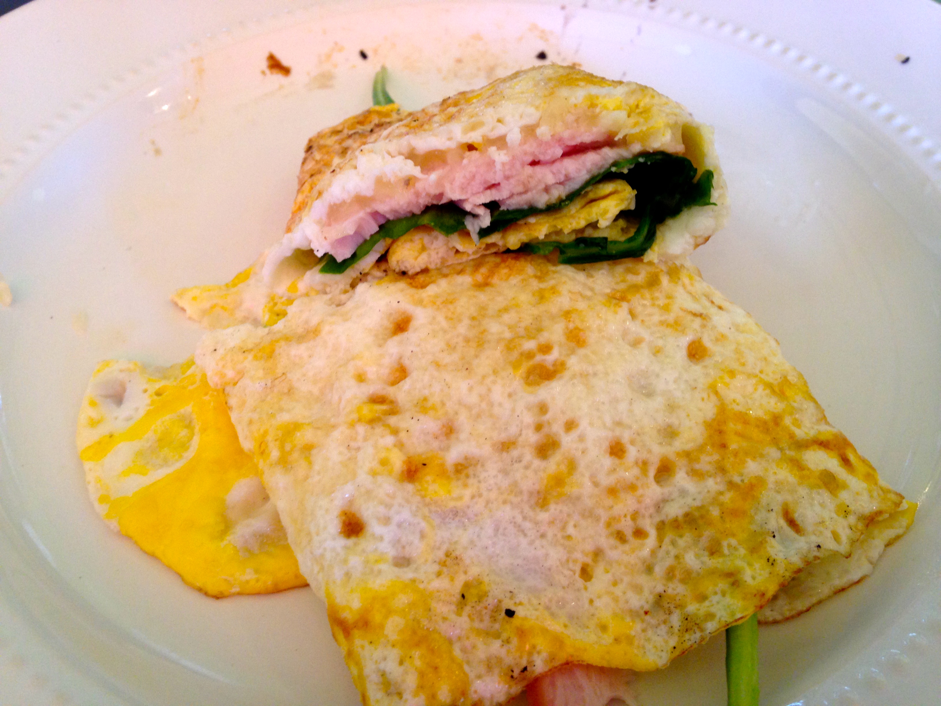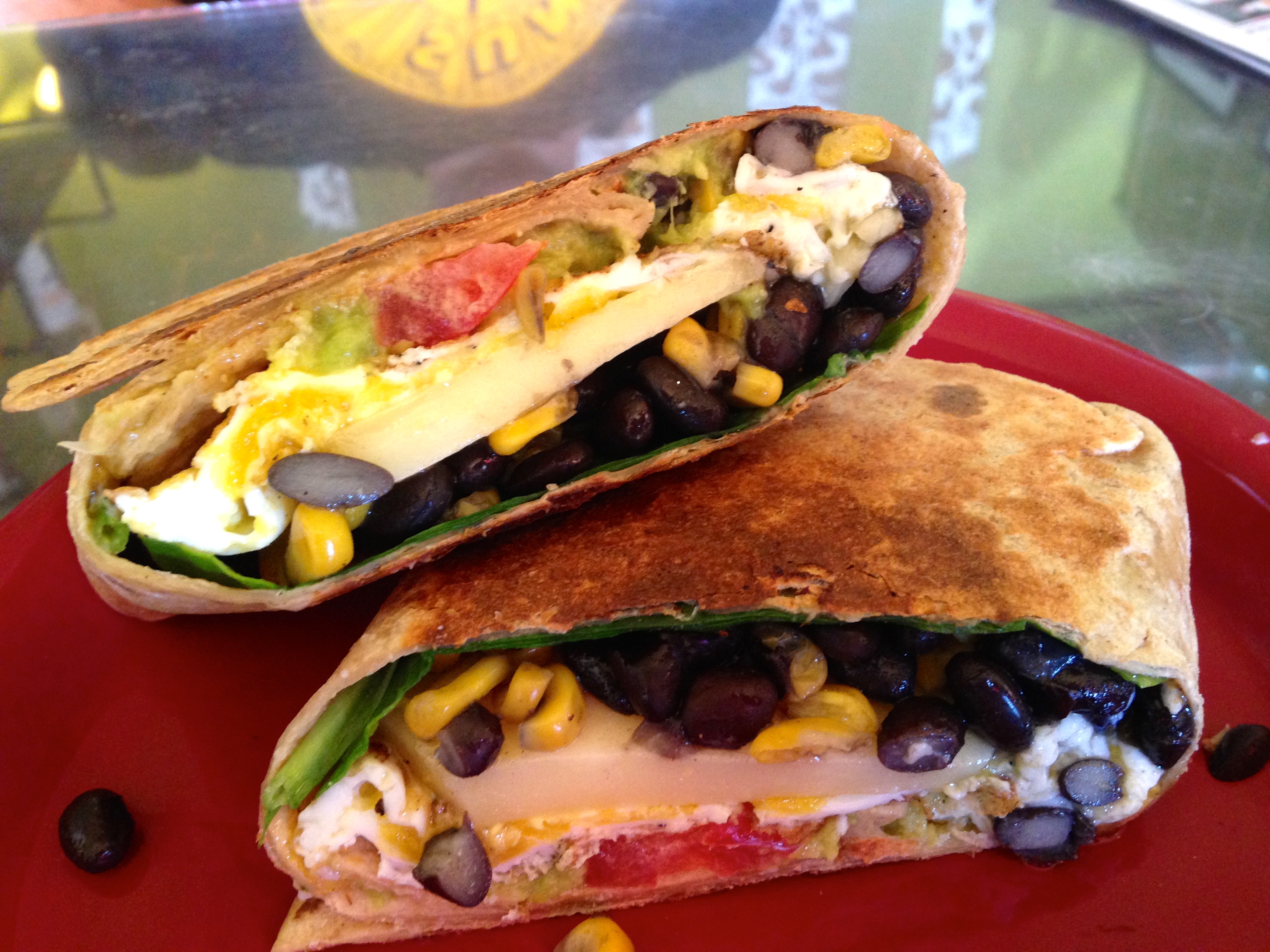 You can get it on wheat, sourdough, a bagel, or an English muffin. We get ours as an omelette, saving those bread calories for later. Folded inside the eggs are turkey, white cheddar cheese and spinach. It’s a hearty dish, but the turkey is way too salty. We kept looking at it wondering if they put ham in by mistake. It looked like turkey and tasted like ham. The dish would have been much better without the turkey. Next time we will go for a peanut butter and banana sandwich.