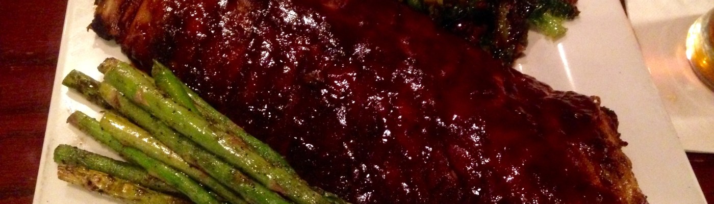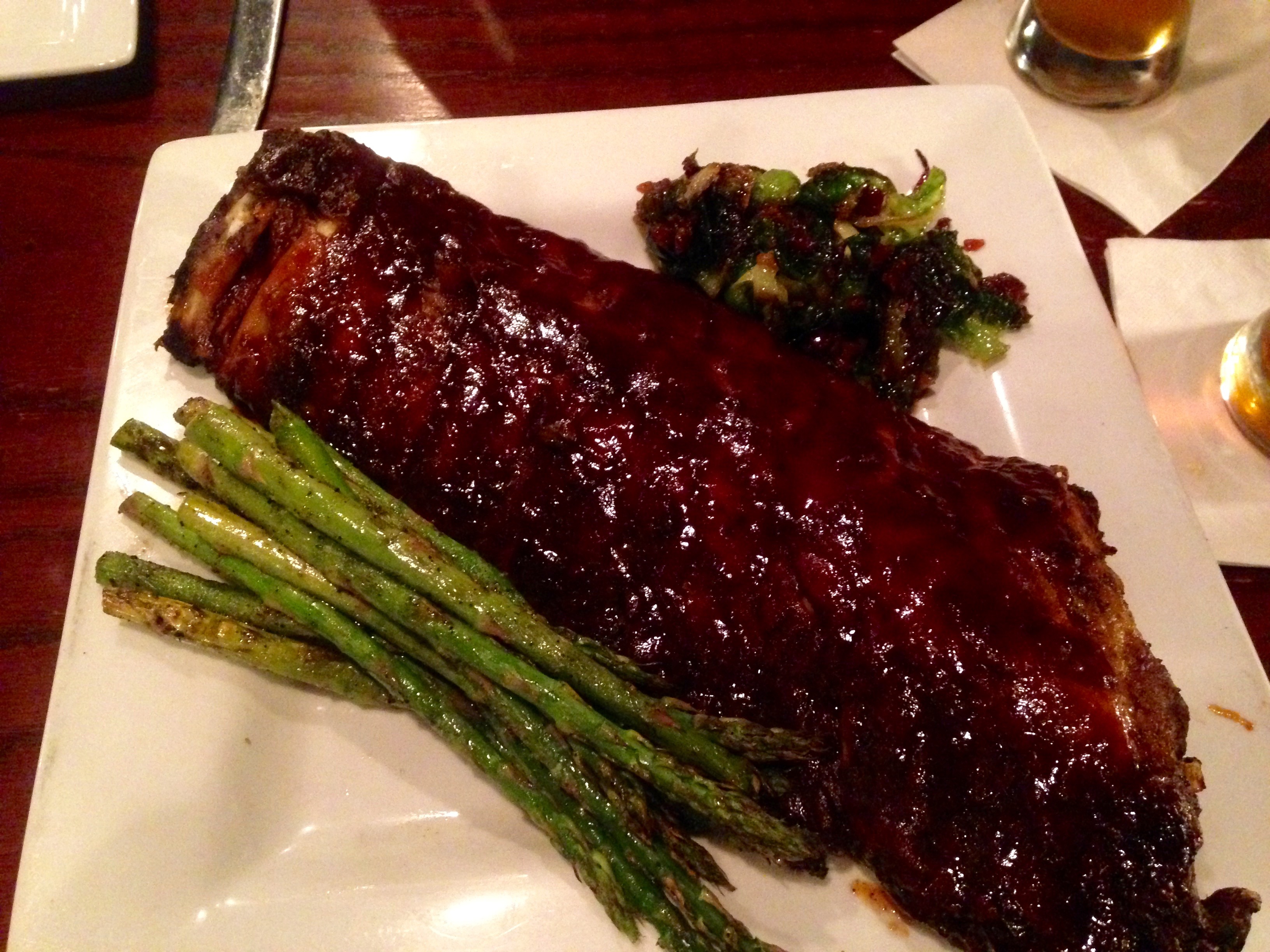 The ribs are fall off the bone delectable with the proper amount of sauce already in place. On the menu, the ribs come with coleslaw and fries but we go healthy and opt for the asparagus and Brussels sprouts. We fancy ourselves as sprouts connoisseurs and order them whenever available. These sprouts with bacon and spicy glaze rate right up near the top of our list. They are nicely roasted to just the right softness, the only complaint is that there weren’t more!