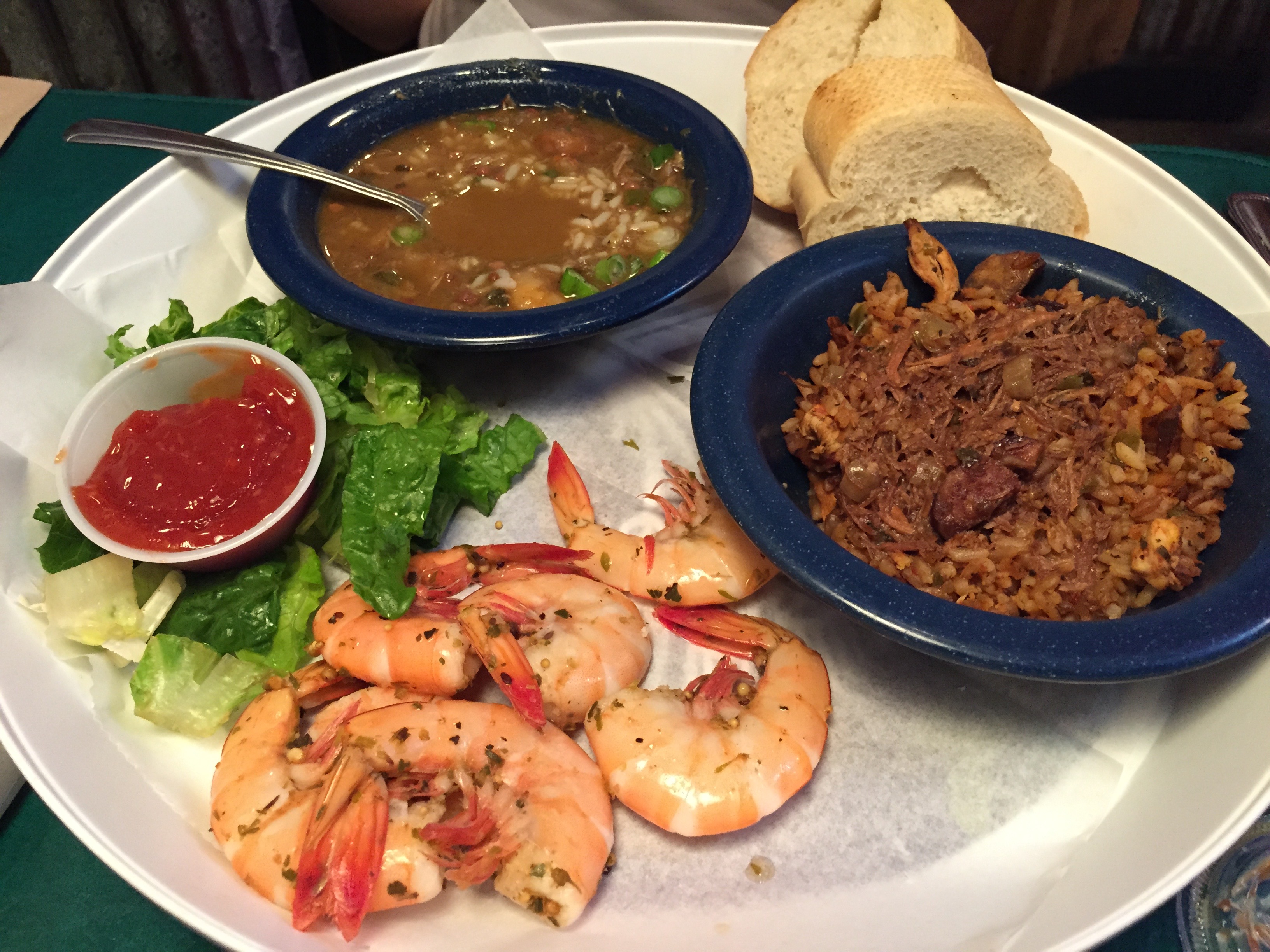 Isn’t this a pretty plate? It lets you try a little of everything, and share with your date if you are nice. The gumbo has a kick as it should. Eve gets seafood, but you can get chicken and sausage as well. Her jambalaya is not as spicy, but it’s full of cajun flavor. The shrimp comes hot or cold. Eve goes with cold, which is better because the shrimp stay a little firmer.