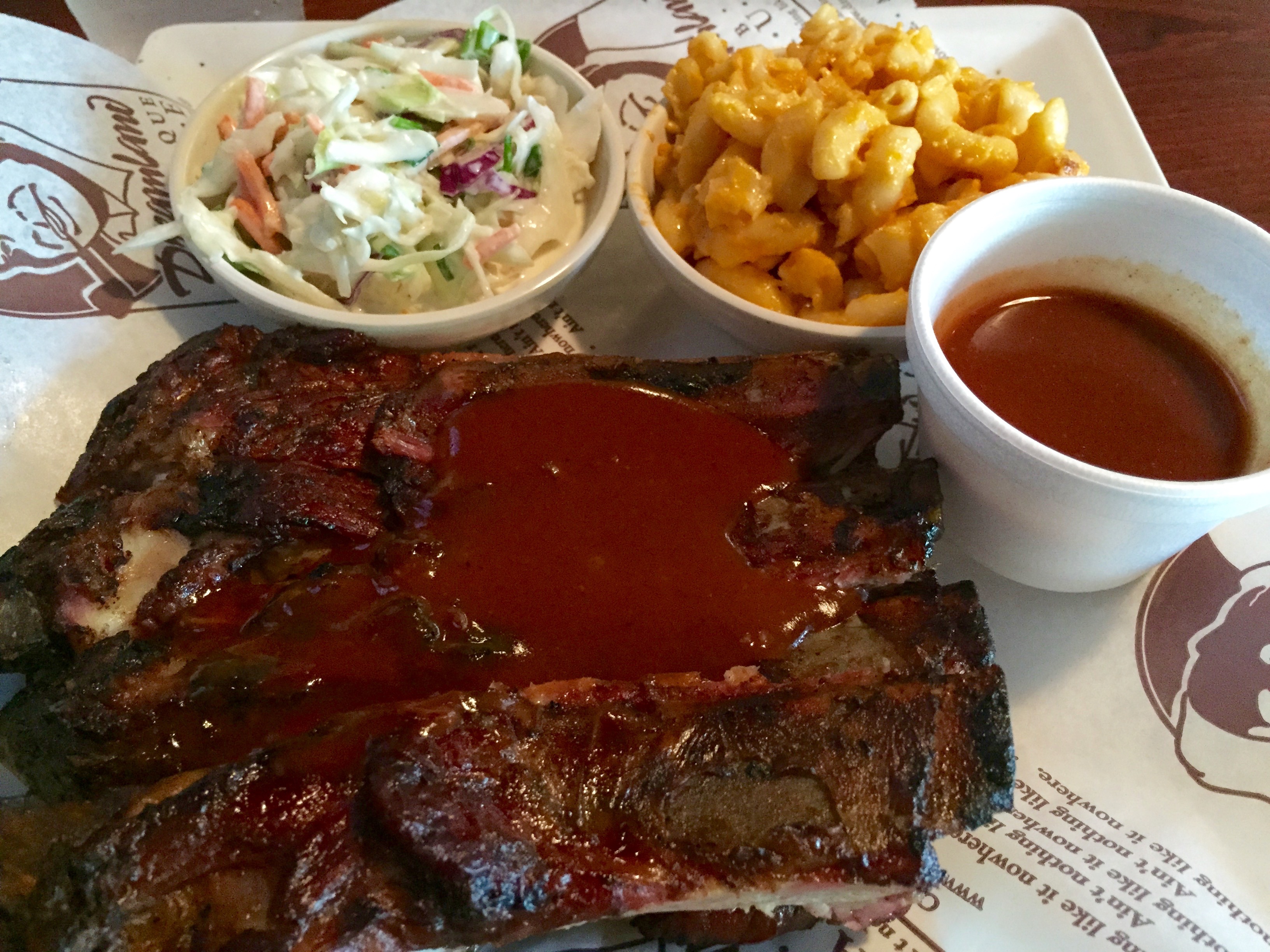 This place was a Western Steer/Sizzler back in the day. If you imagine real hard, you can still see the steaks sizzlin’ in the kitchen. The decor is totally University of Alabama, which makes this Georgia fan a bit uncomfortable. There are lots of license plates and metal signs up on the walls, as well as pictures of some old guy in a houndstooth hat. The official Date Night photographer is out of town, and I forget to take a picture of the inside. I do remember to take a picture of my ribs.
