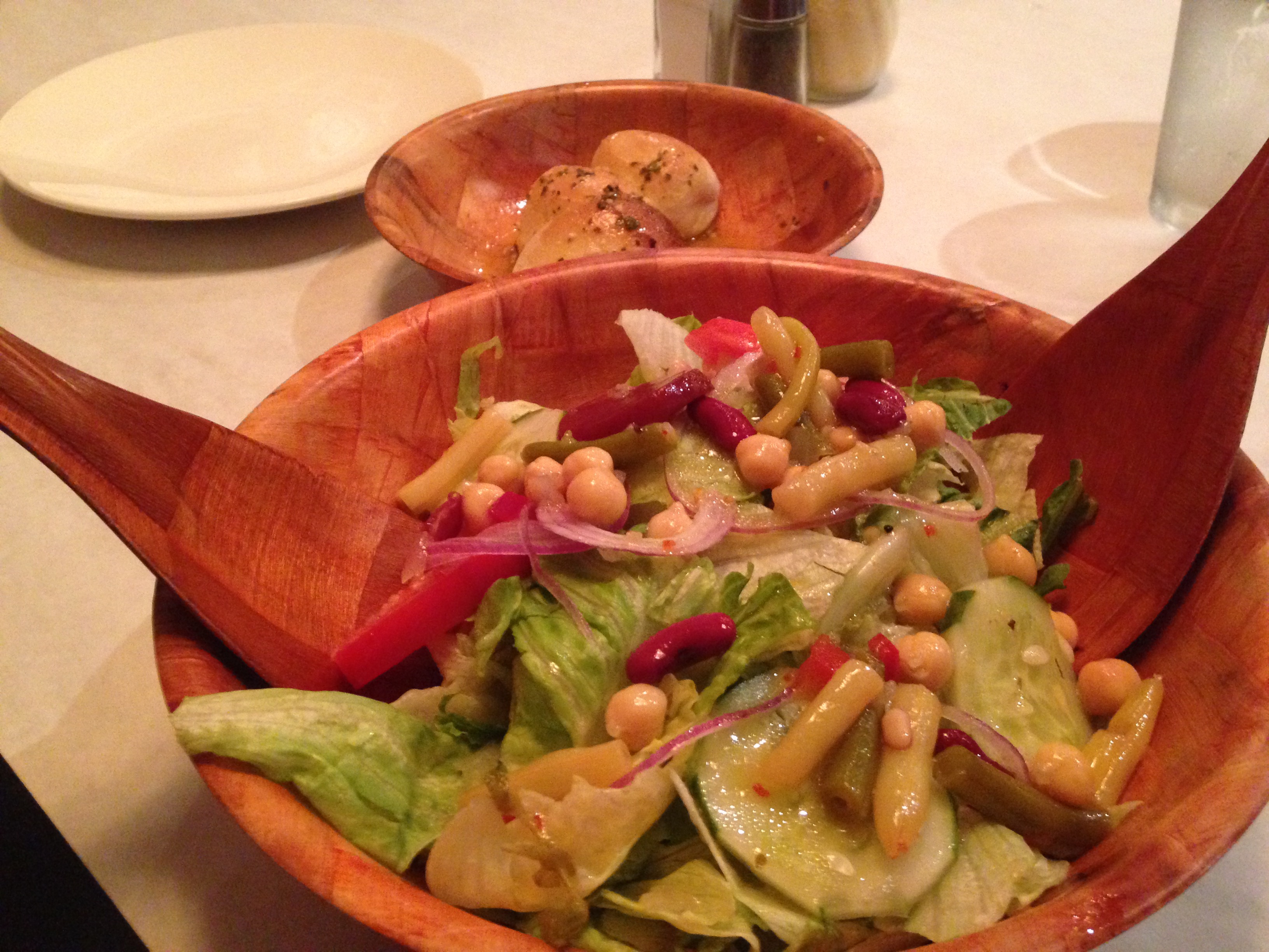 They give you a lot of dressing with the salad, so if you would prefer less, order it on the side. The rolls are served in garlic and butter, because that’s how you eat them in Italian places. You can order them plain if you wish.