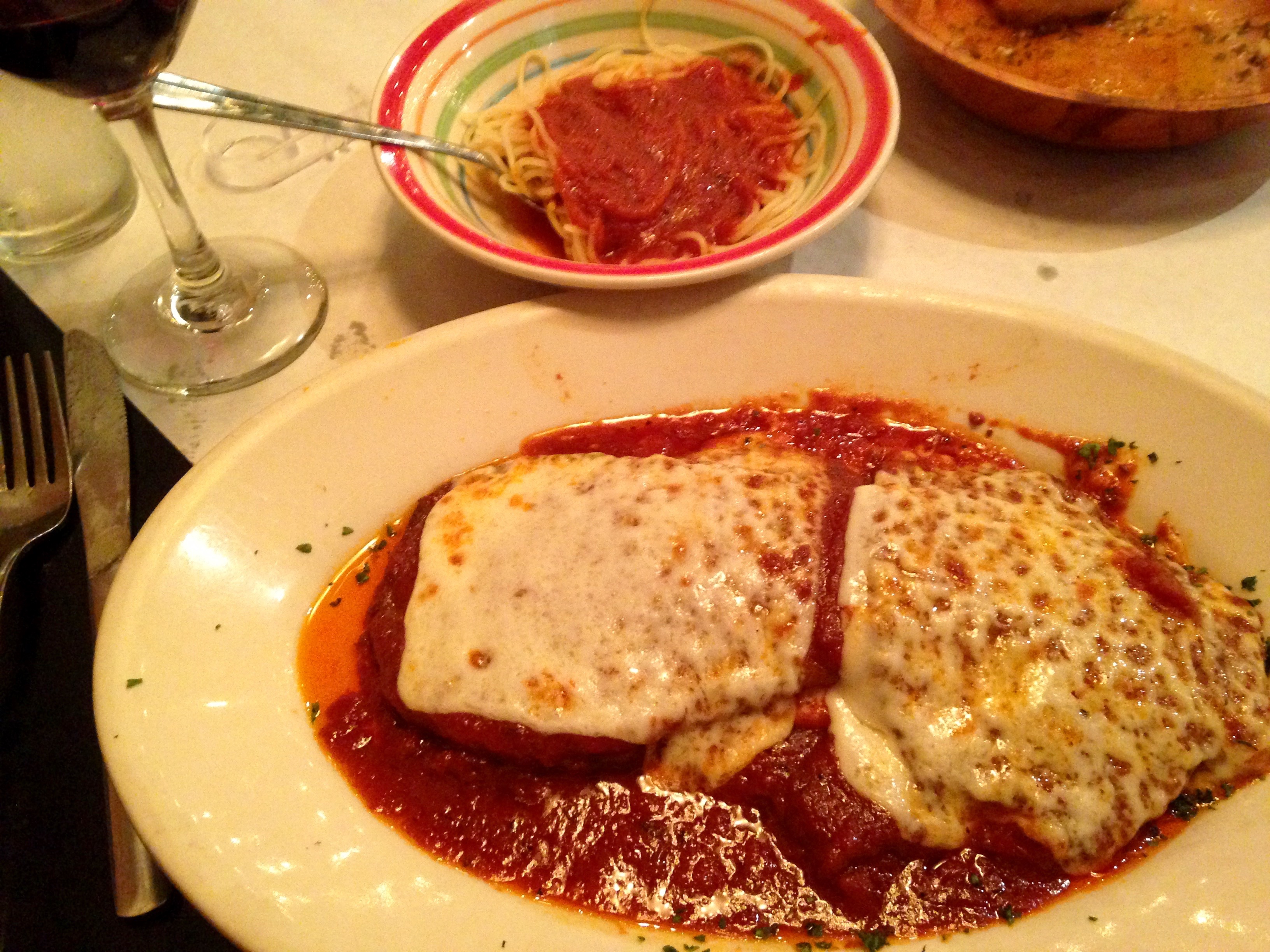 It comes with a side of spaghetti. It’s made from fresh eggplant, not frozen. It’s breaded lighter than normal eggplant parm, so you don’t feel like your dinner is that heavy. Again, the portion size is large and we take some of it home to eat for lunch.