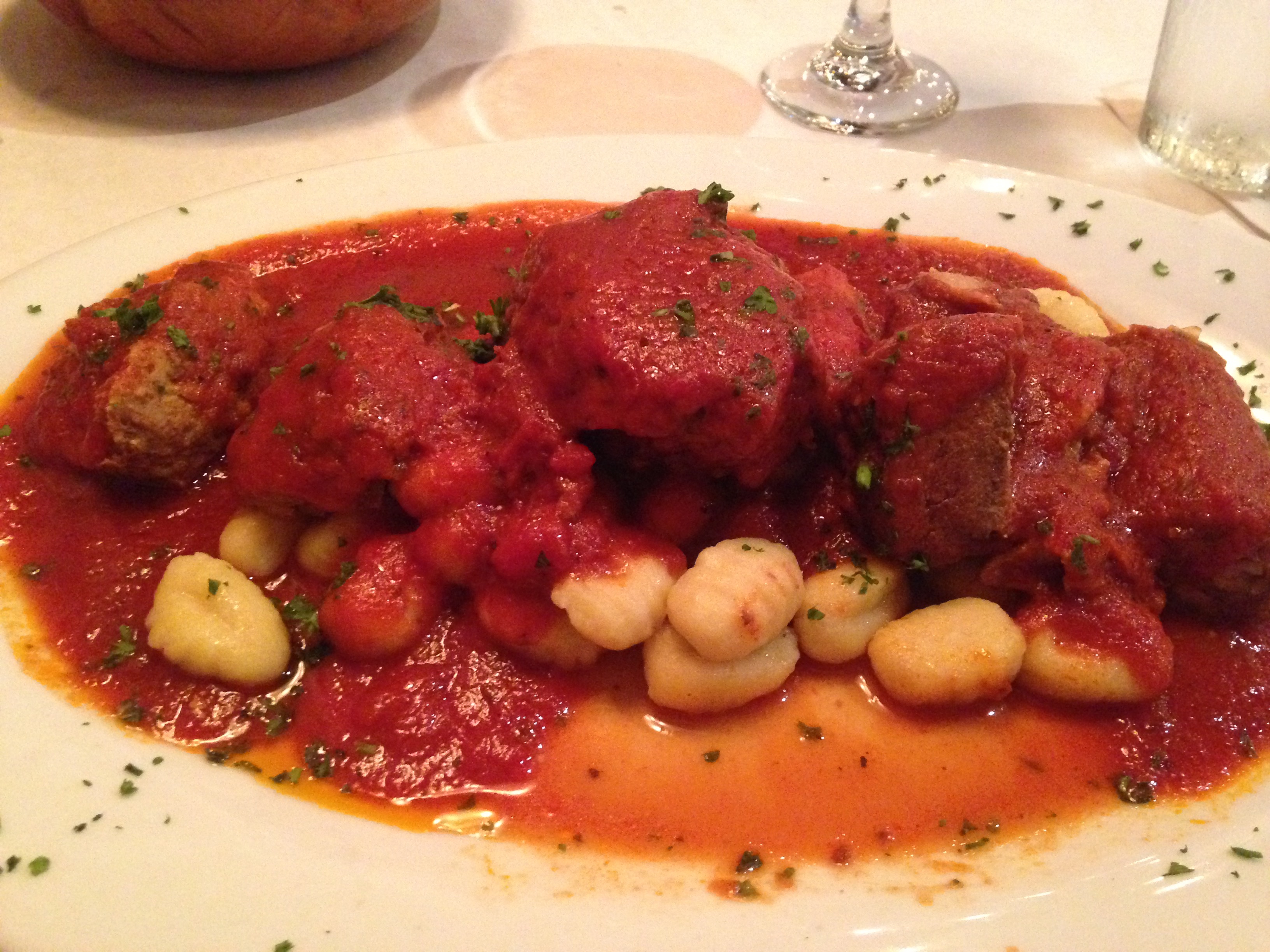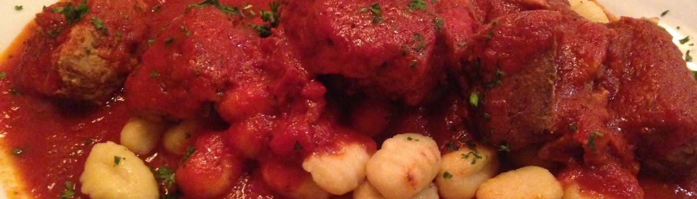 Even though it’s Friday, I order the Sunday dinner. I love Italian combo plates because it lets you taste a little of everything. This one comes with veal meatballs, sausage and Grandpa’s braised pork, all served over gnocchi. The meatballs are soft and tasty. You can tell that the pork has been cooking for a long time as it’s soft too, but in a good way. I would like a little more sausage because it is so good. My only complaint is with the gnocchi, which may be too fragile for this dish. Many of the potato-filled pillows get smushed by the heavy weight of the meat and the sauce. I might have liked it better on plain pasta. This is a lot of food and some of it comes home.