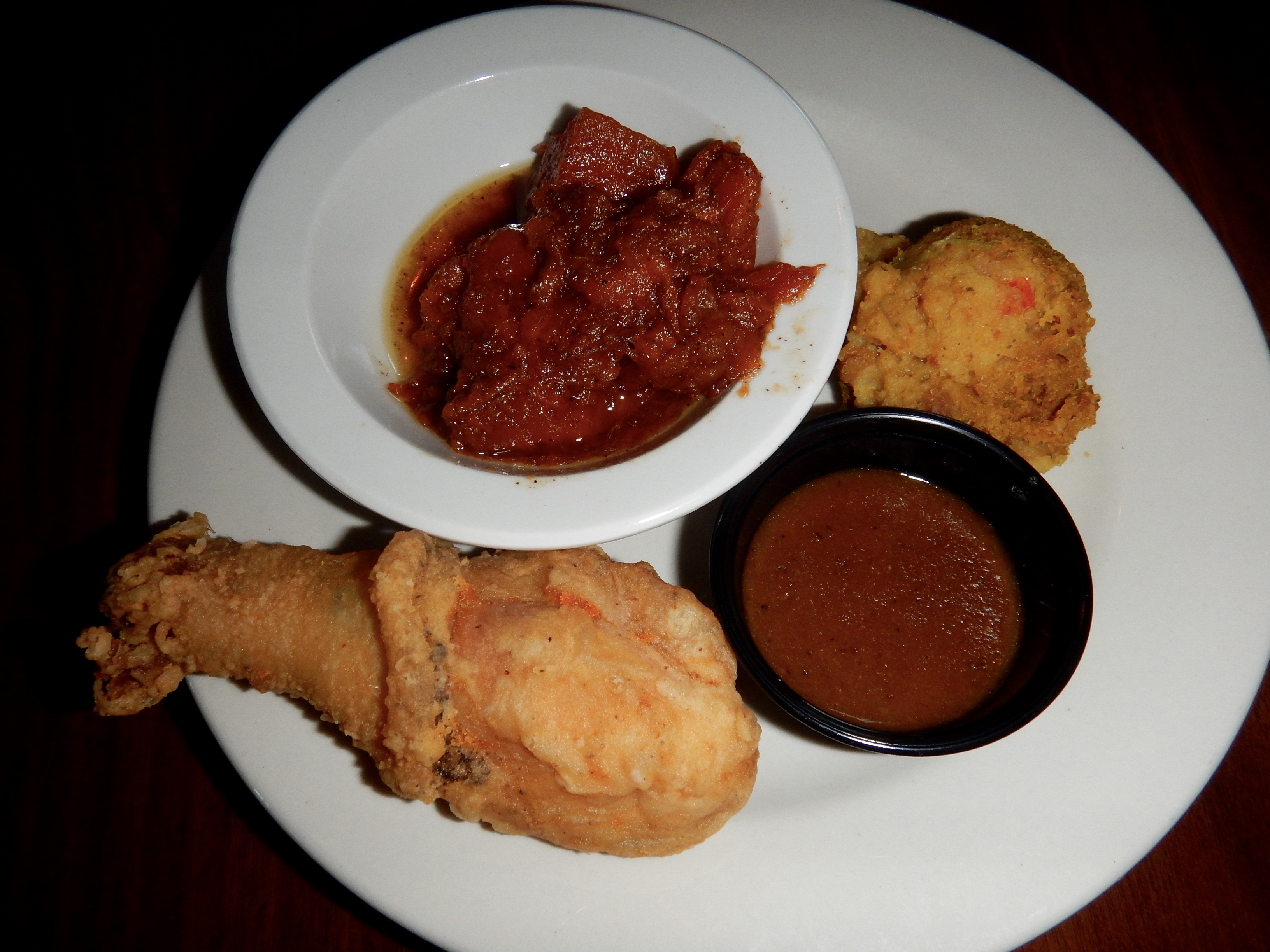 The chicken is hot and fresh and fried perfectly. I don’t eat fried chicken very often, but when I do, I want it to taste like this! The sweet potatoes are probably the sweetest I have ever eaten. They are tasty but I cannot imagine how much sweetener goes into this dish.