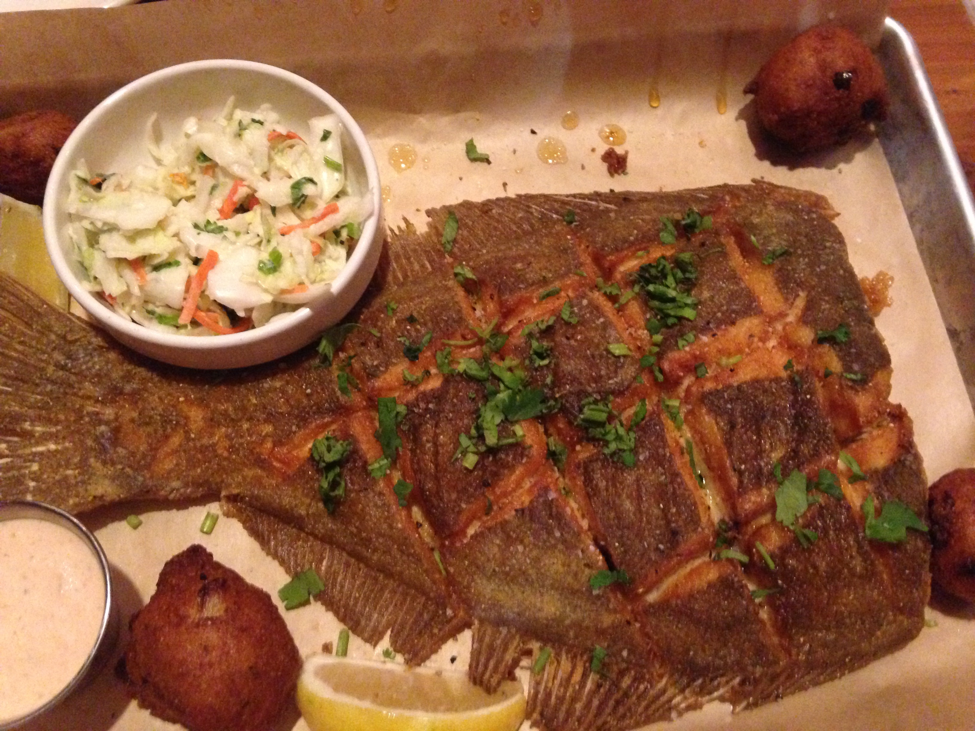 It’s visually pleasing, crunchy on the outside, and moist and tender on the inside. The portion is very large and a to-go box will accompany us home. It is served with hush puppies and a tasty coleslaw.