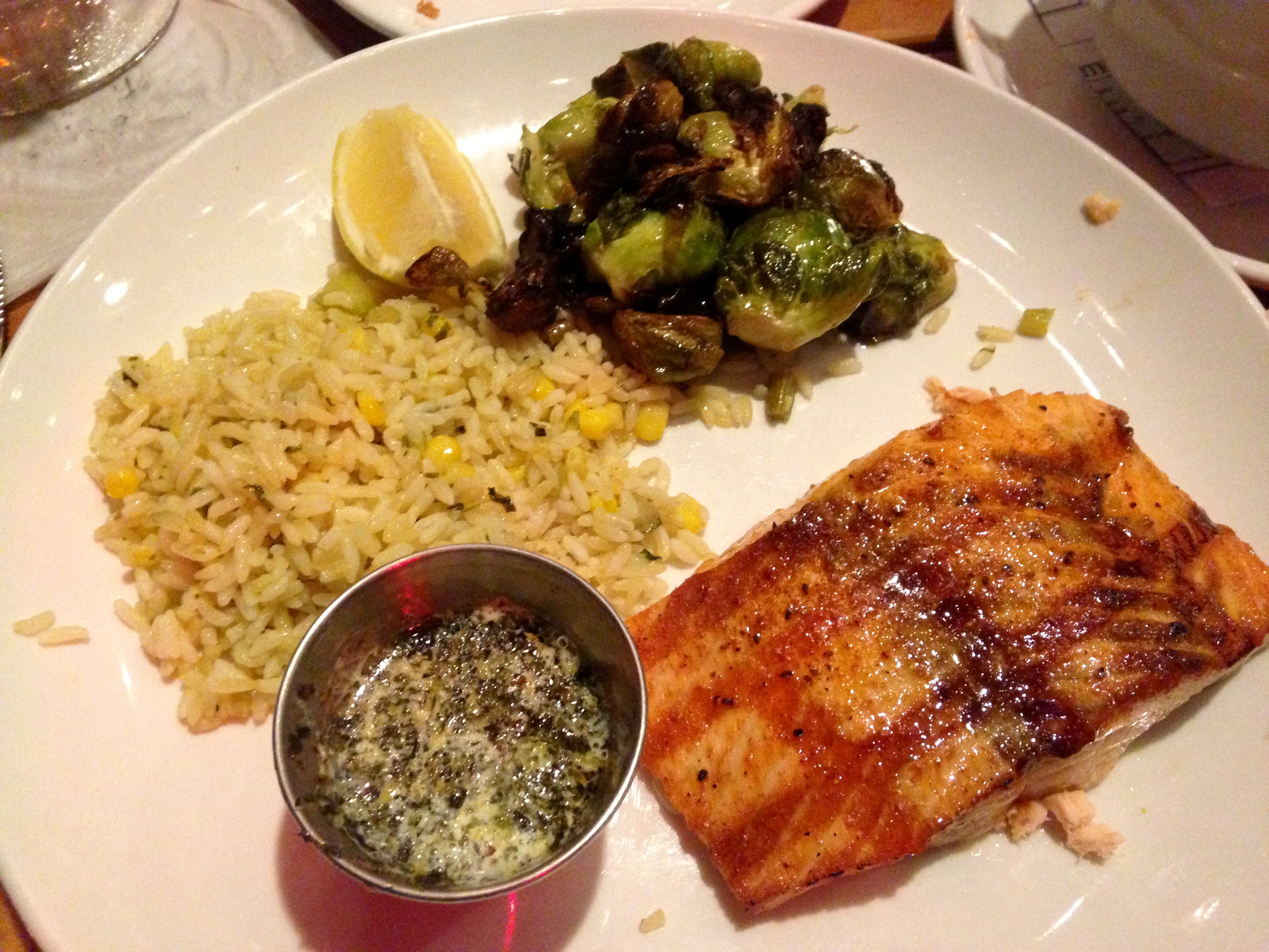 I get the salmon grilled with an herb citrus butter sauce. It comes with a nice arugula salad and rice as well as a choice of one side, which in my case is brussels sprouts. This is an excellent dish. The salmon is moist and nicely seasoned, and I enjoy the roasted sprouts.