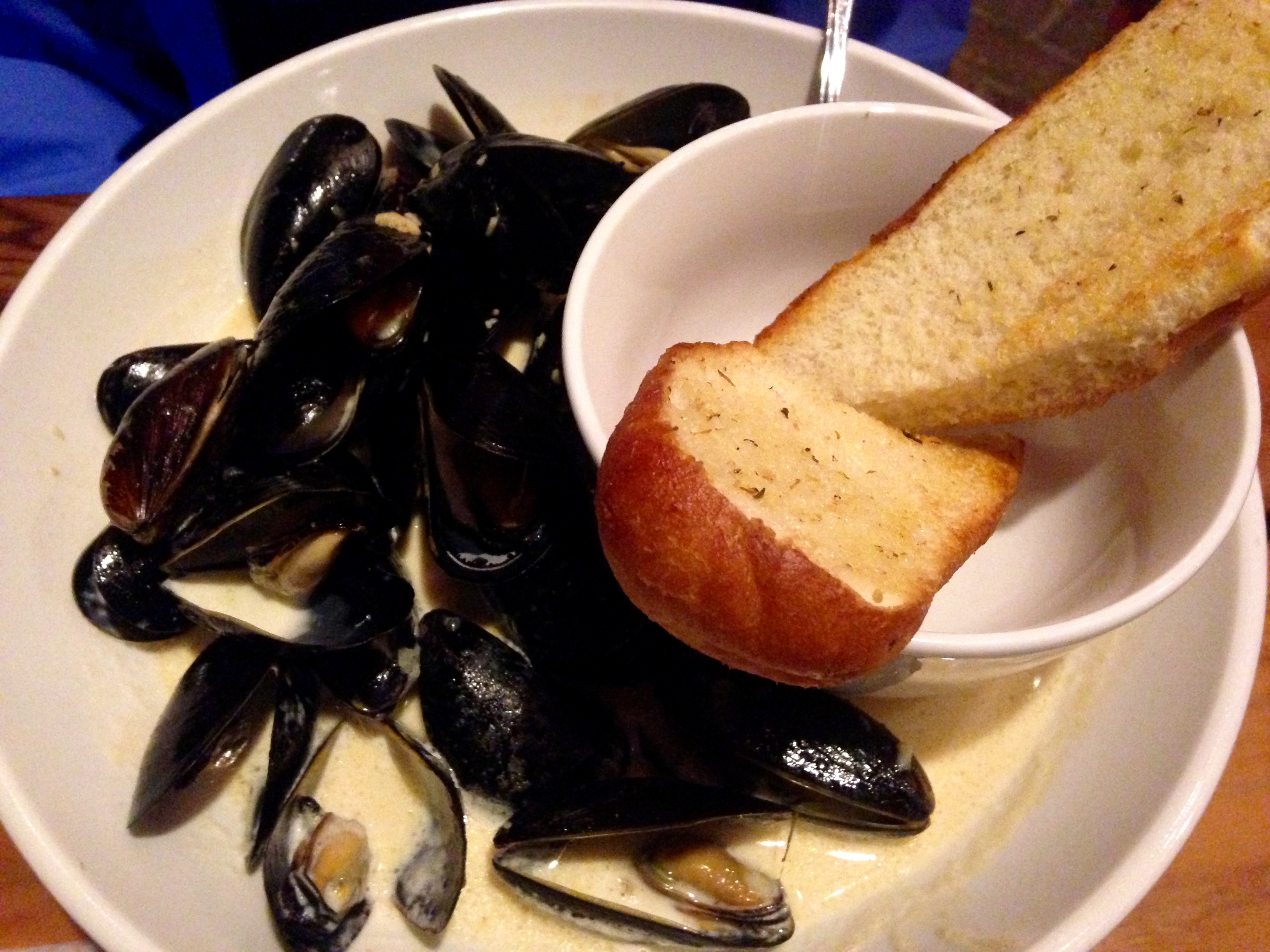 The mussels are really listed as an appetizer, but there is more than enough in the bowl to make a meal of them. She wants to pick up the bowl and drink the broth, and we don’t stop her.