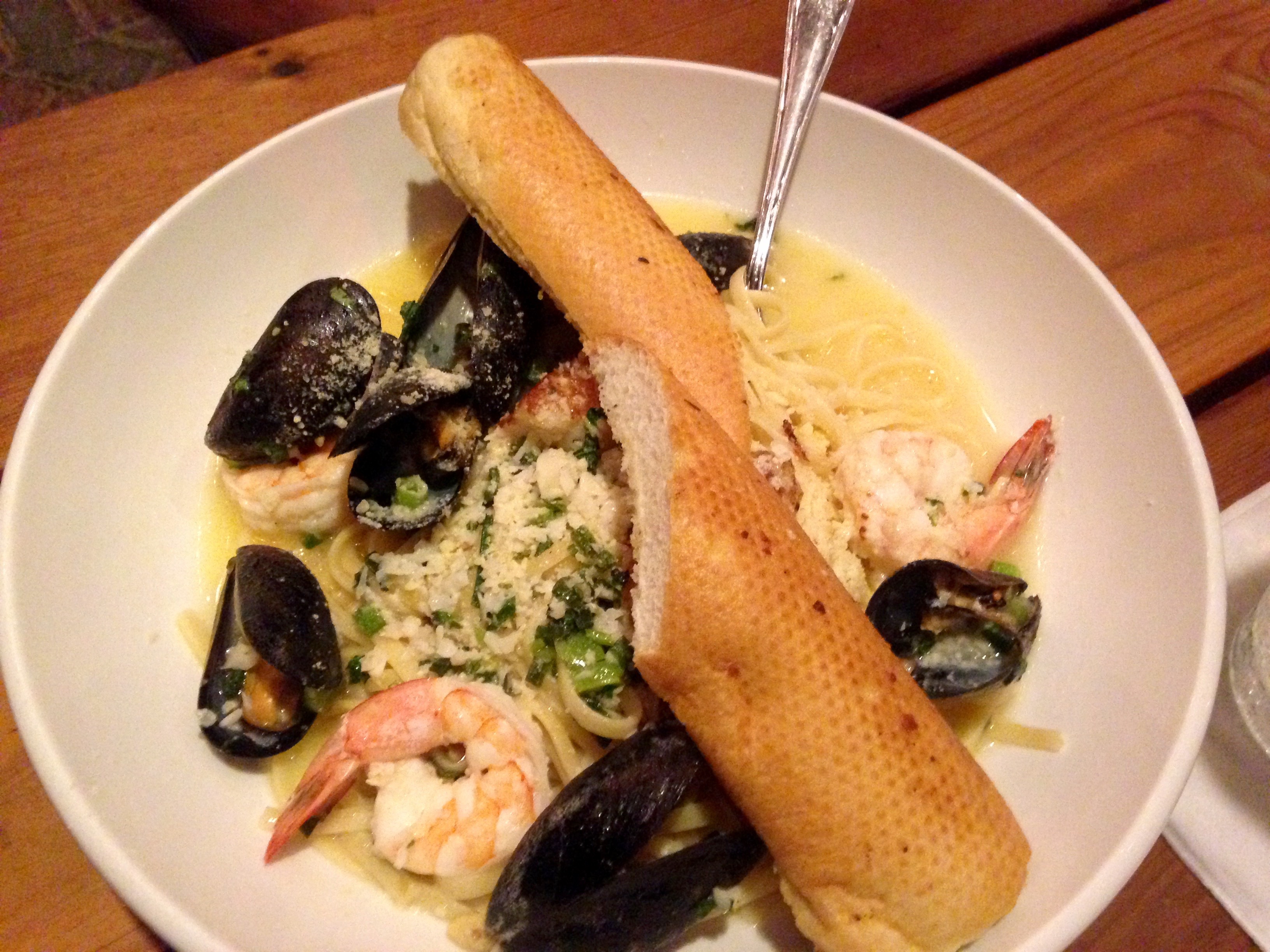 Randy succumbs to the (al)lure of the seafood scampi served over pasta.