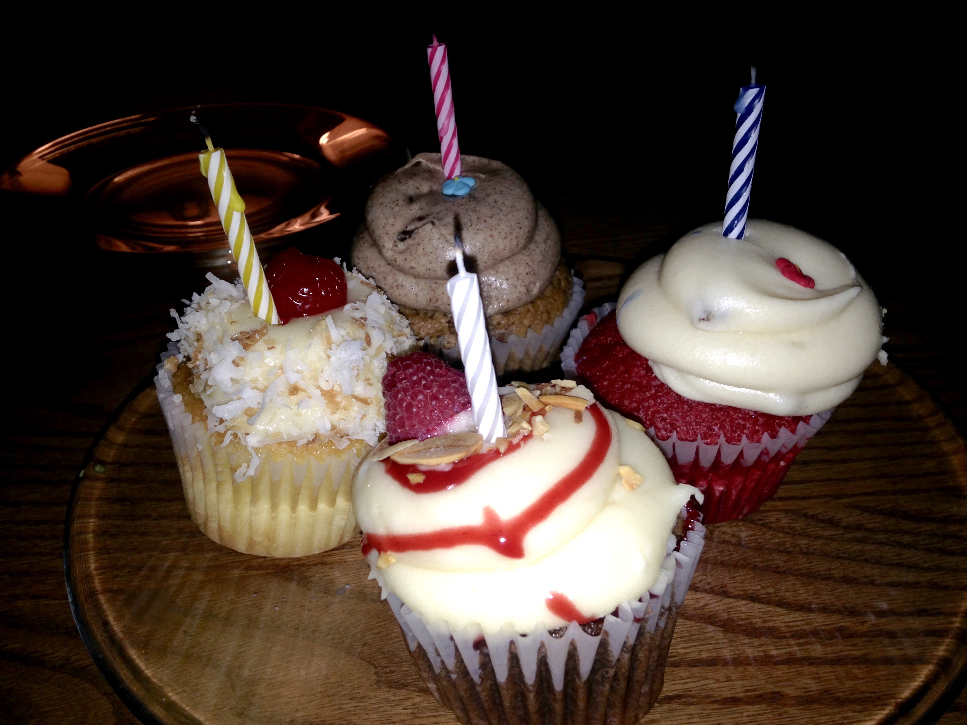 Yes, those are Cami Cakes! We each enjoy a taste of 4 cupcakes. From the upper left, carrot, red velvet, chocolate almond, and coconut pineapple. They are perfect for any celebration, especially this one.