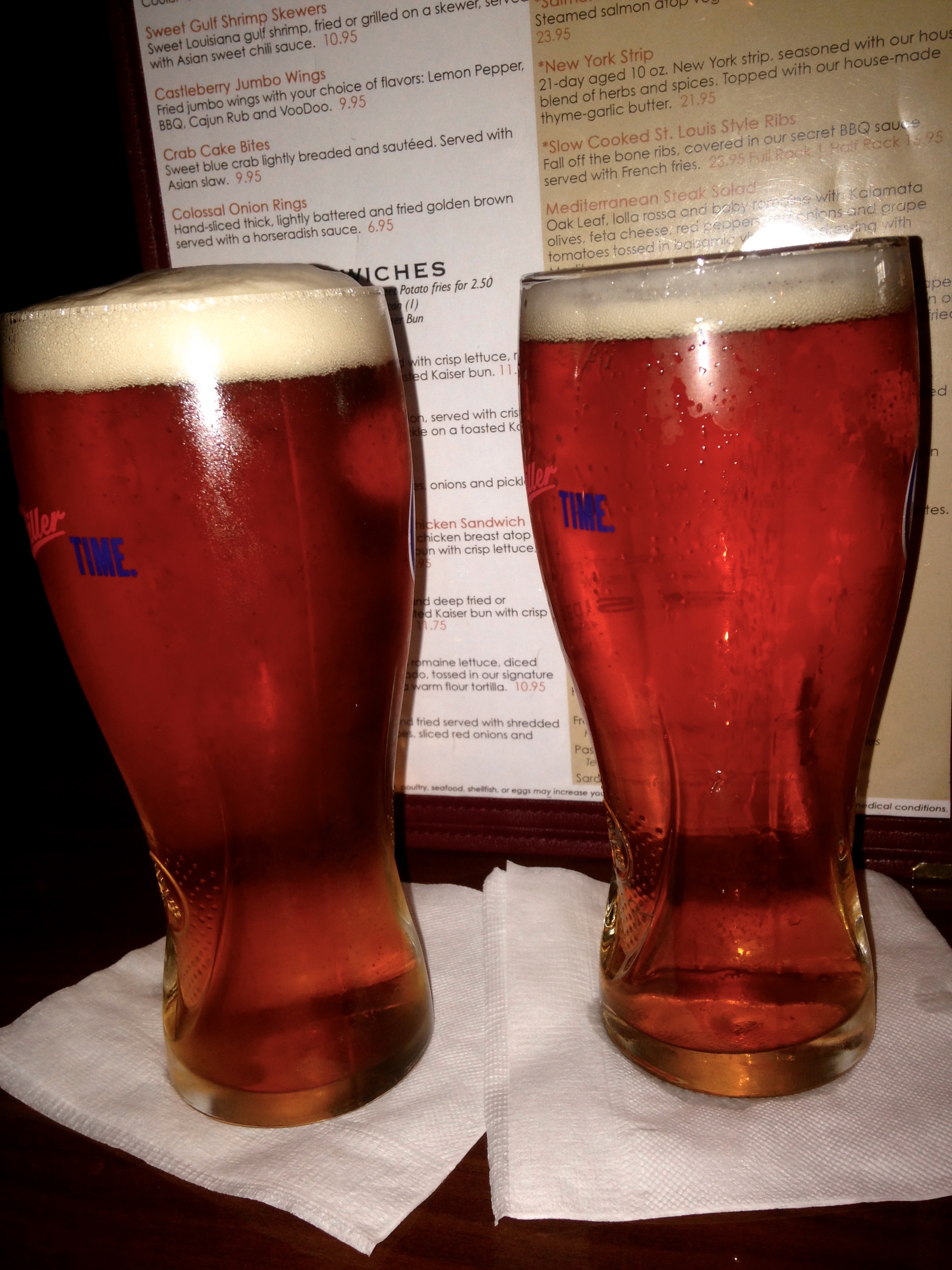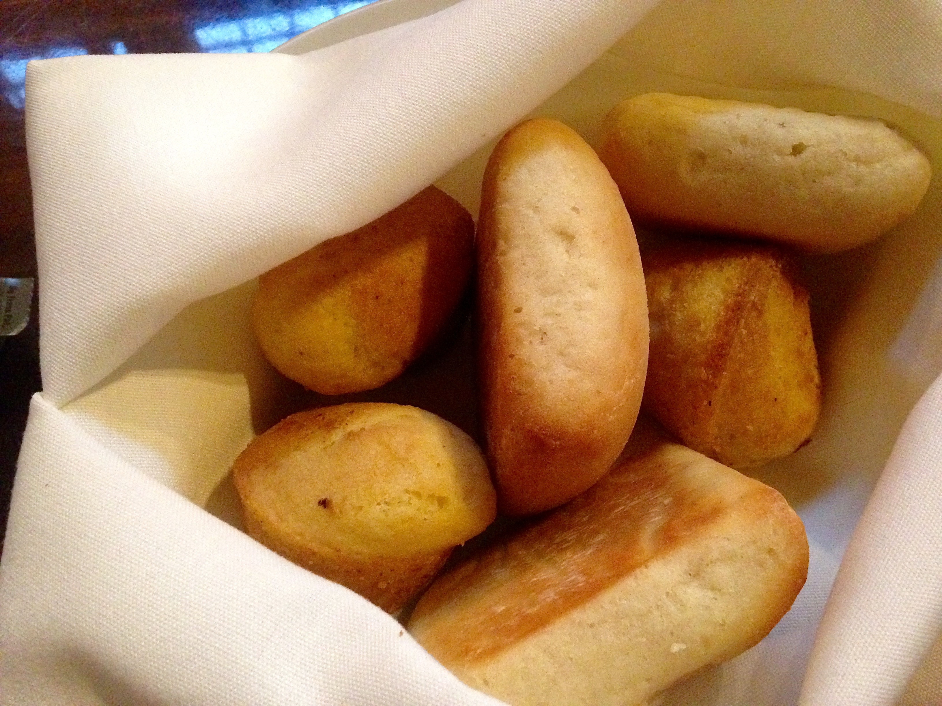 The beers come in Miller glasses. We won’t tell the Sam Adams folks in Boston. We are hungry, and are happy to see the basket of bread delivered to the table.