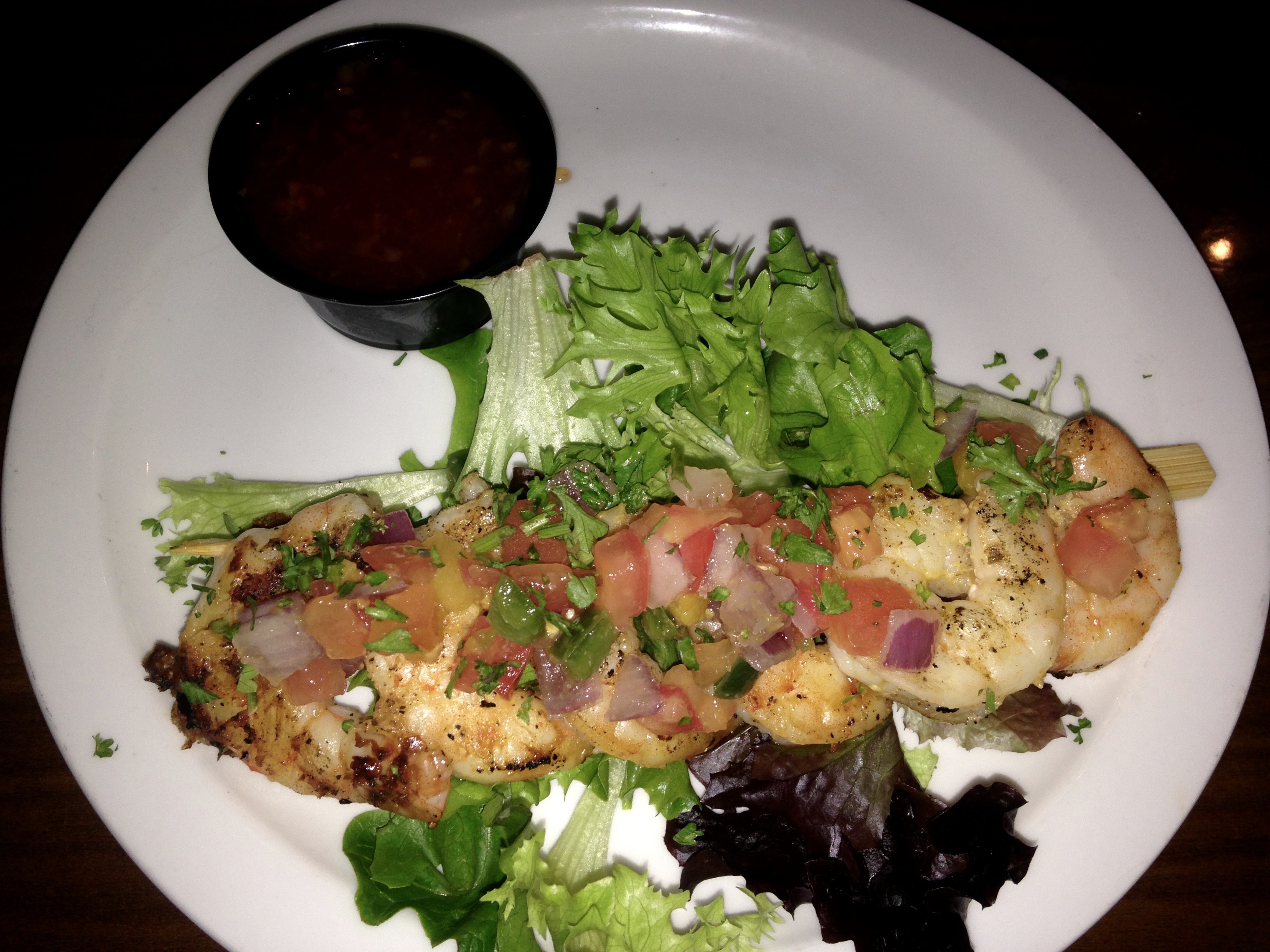 Surprisingly, the menu has a Cajun influence. There’s lots of crab and shrimp, something you would find in Louisiana. We start off with the shrimp skewers.