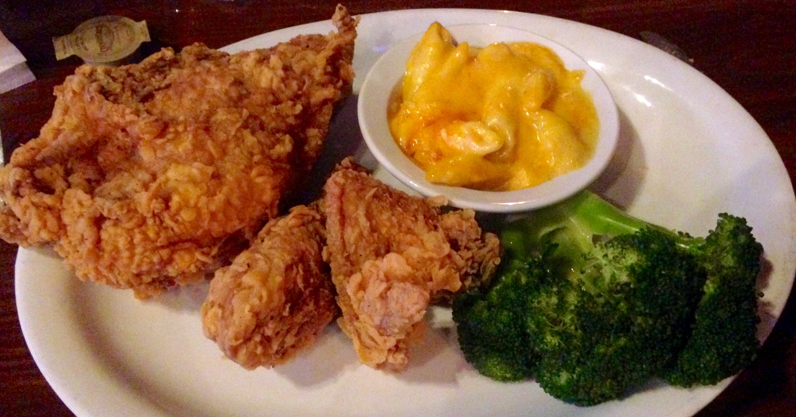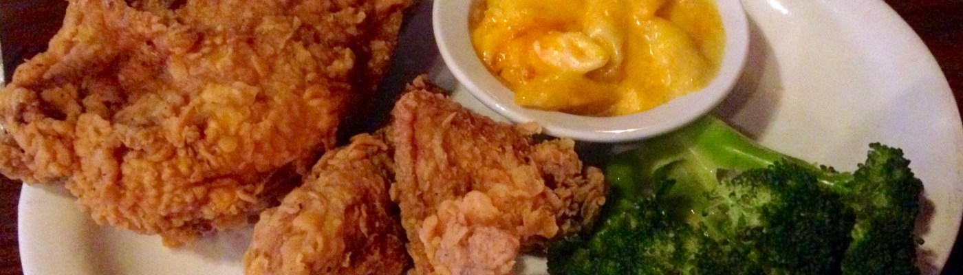 Here is the star (highlighted in red no less) of the Paschal’s menu, the “Famous 1947 Fried Chicken”. This is the same recipe that the Paschal brothers first fried up in (wait for it) 1947 and have been serving ever since. If you are going to blow the calories on fried chicken, you should eat good fried chicken and this fits the bill. It’s hot, fresh, and just came out of the fryer. The skin is crunchy and I find myself eating the crumbs off the plate. As for the sides, you can go for the soul food like collards, yams, or fried okra. I get mac and cheese and broccoli. The mac and cheese is good, but we have had better. Broccoli is broccoli–you either like it or you don’t. Unlike the fried okra that I really want, this is steamed and very healthy.