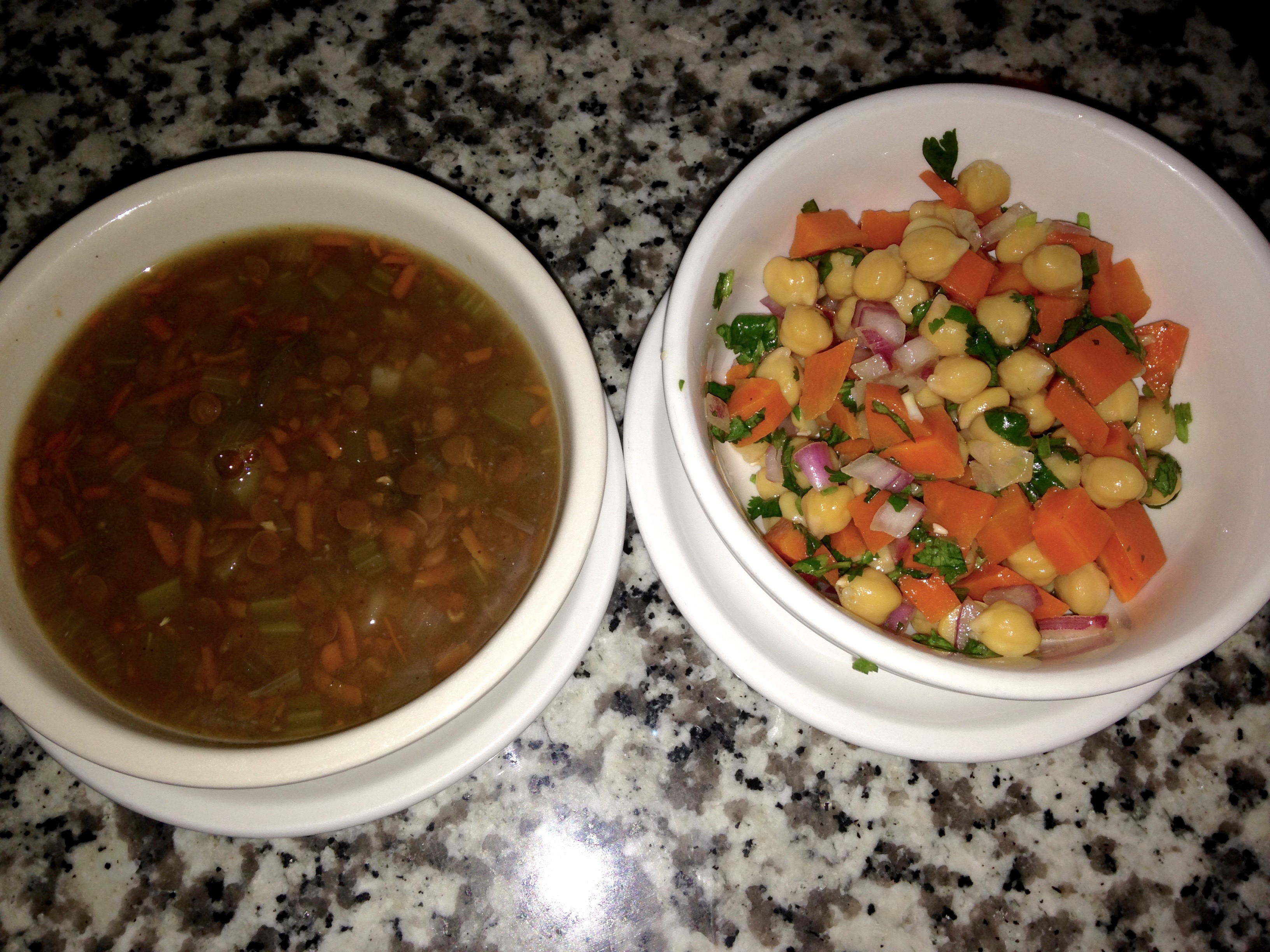 Lentil soup is nice on this cold night. The garbanzo bean salad features slightly cooked carrots and some onion. We liked the soup better.