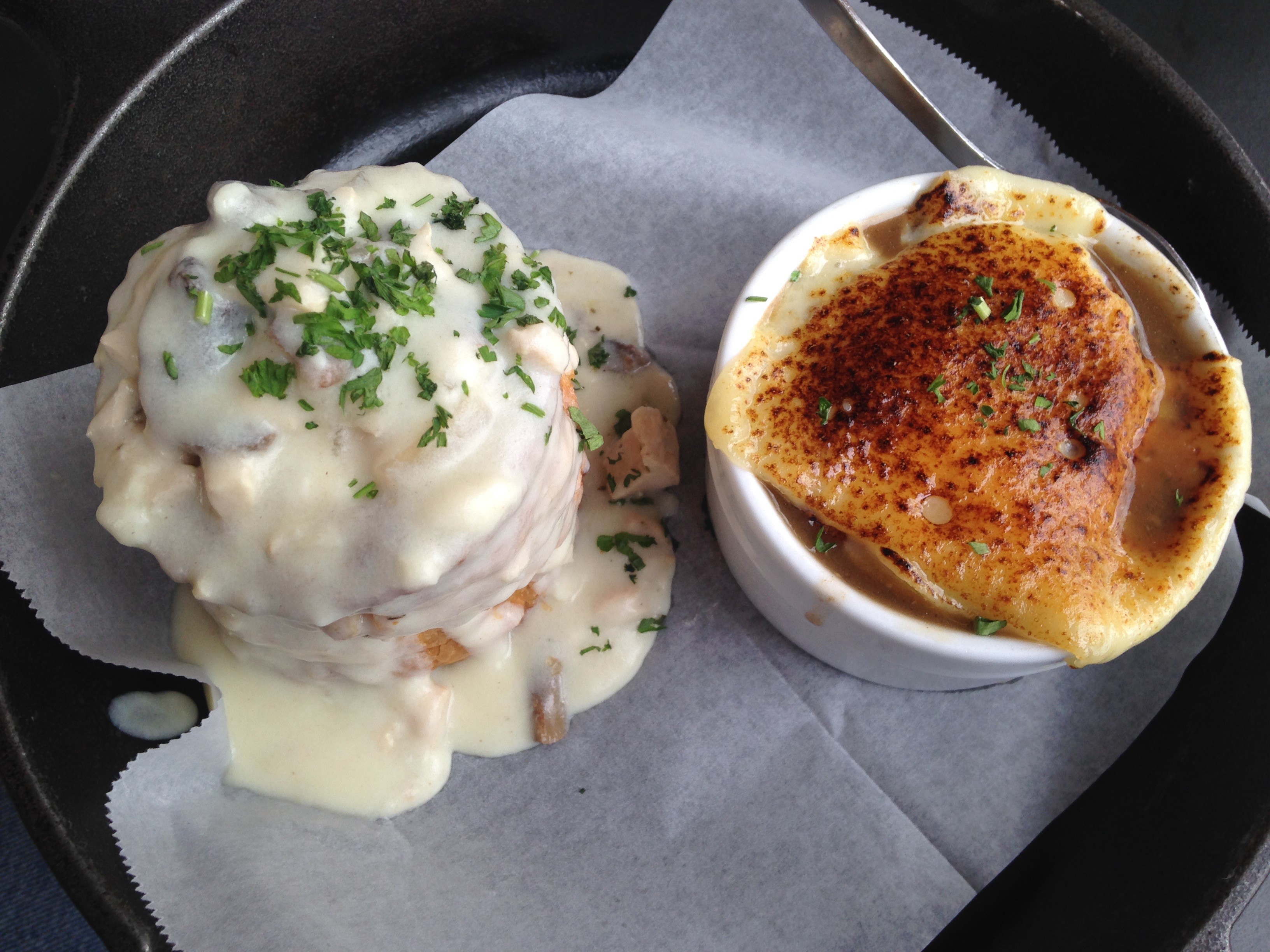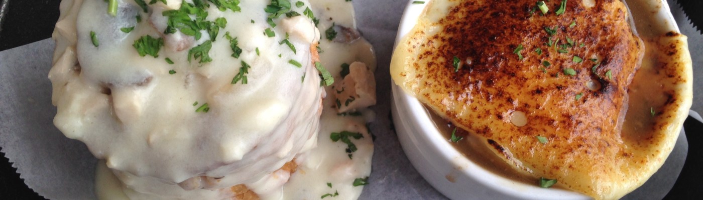 JoAnn skips the pastry, but I go all in on pastry with my lunch choice. It’s the Bouche a la Reine, with French Onion soup.