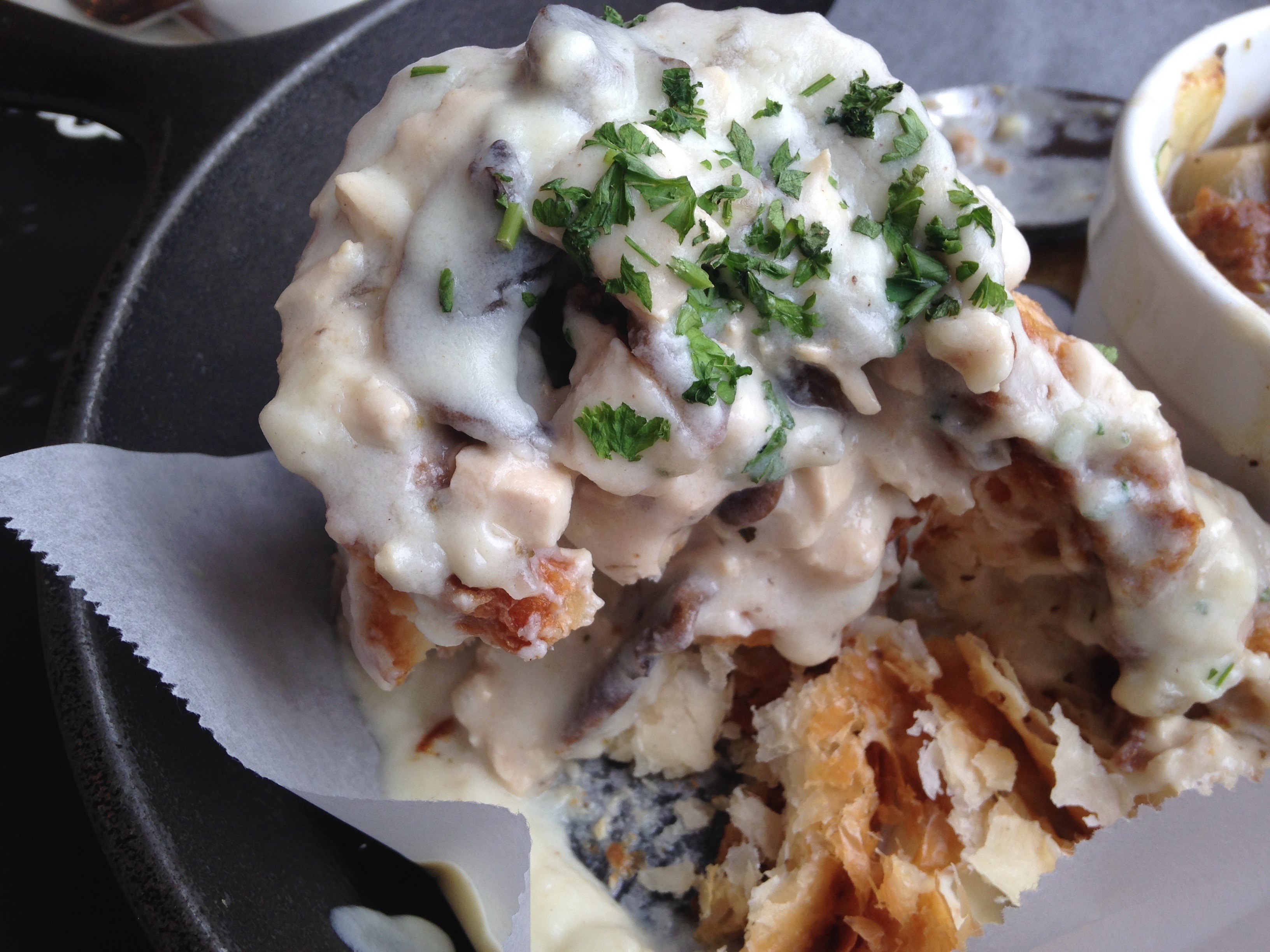 And I think that means giant pastry puff filled with chicken and mushrooms and topped with rich, creamy béchamel. If you aren’t counting calories, I highly recommend this dish. It’s fantastic. The pastry is very light, delicate and flaky. Here is a closer look at what is on the inside.