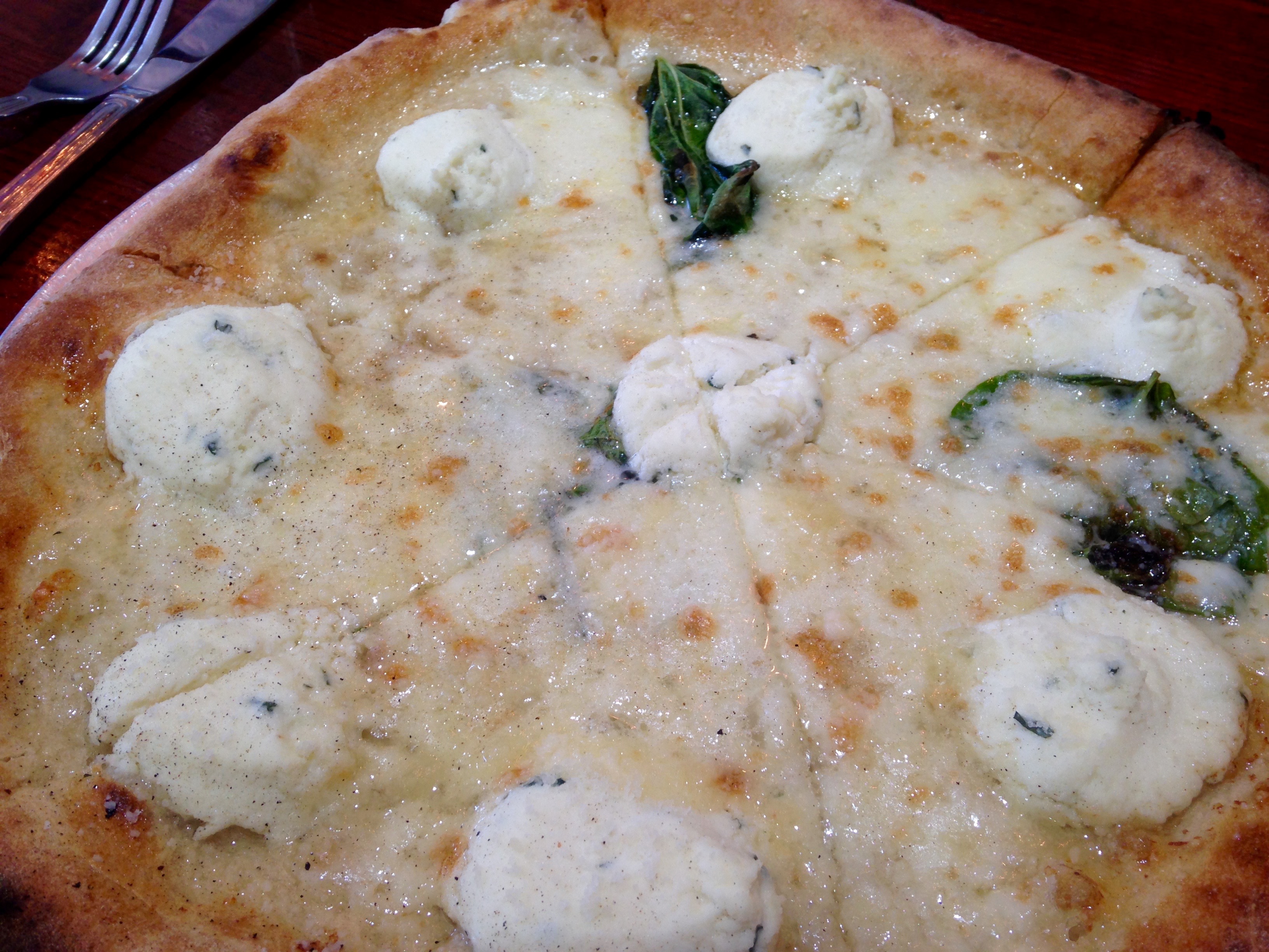 As the name suggests, this is a white pizza. Ricotta, mozzarella, pecorino, basil and garlic olive oil are in this one. The garlic oil gives it an incredible aroma. Garlic-loving vegetarians will like this pie. Now what about that pizza crust? Fugheddaboutit!