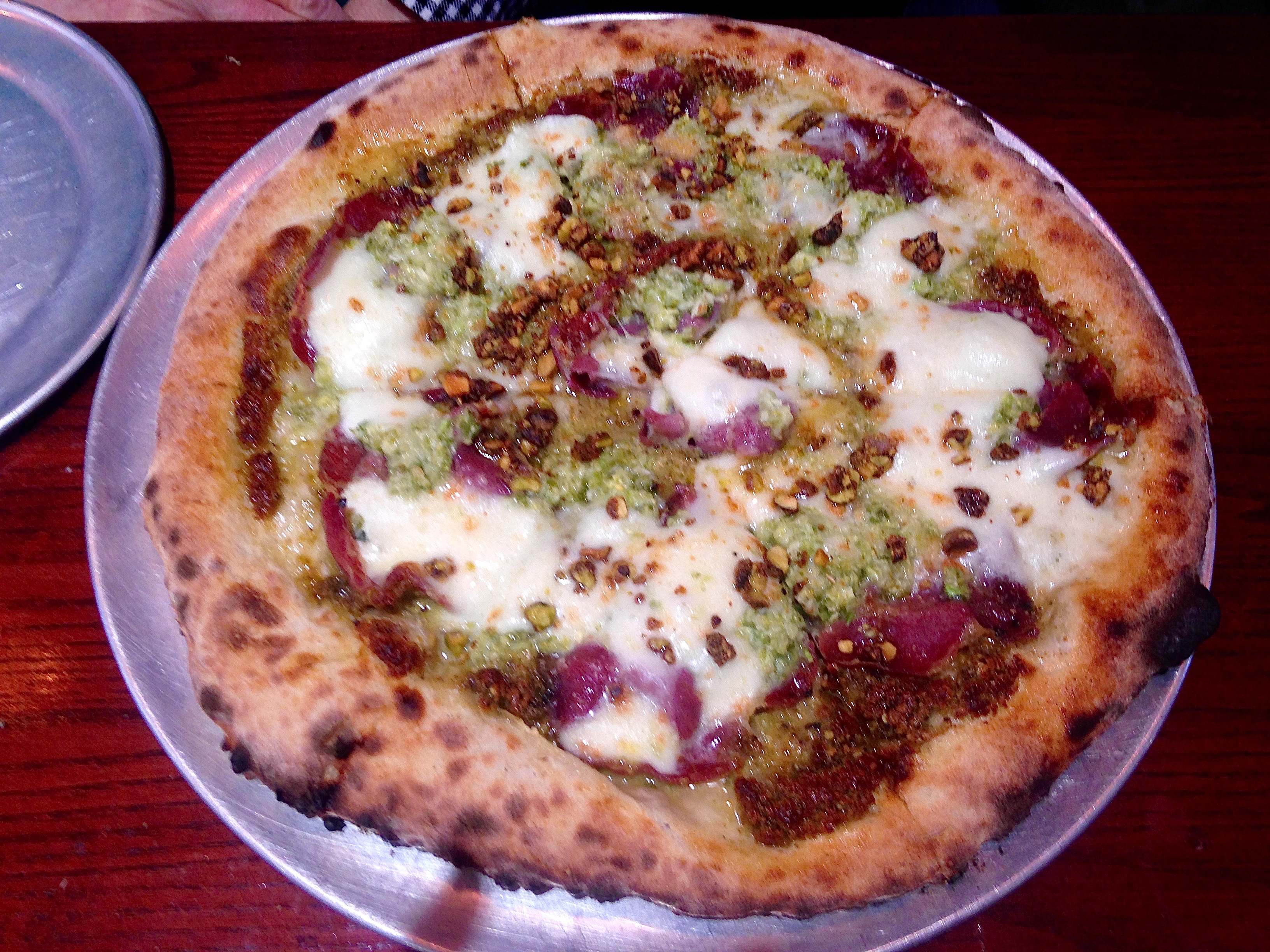 Are you a pistachio pizza person? If you are, this one is for you. Pistachio pesto, capicola, Brussels sprouts and candied pistachios top this pie. Is this a good time to talk about the pizza dough? Let’s take a look at Eve’s pizza, the “Bianca”.