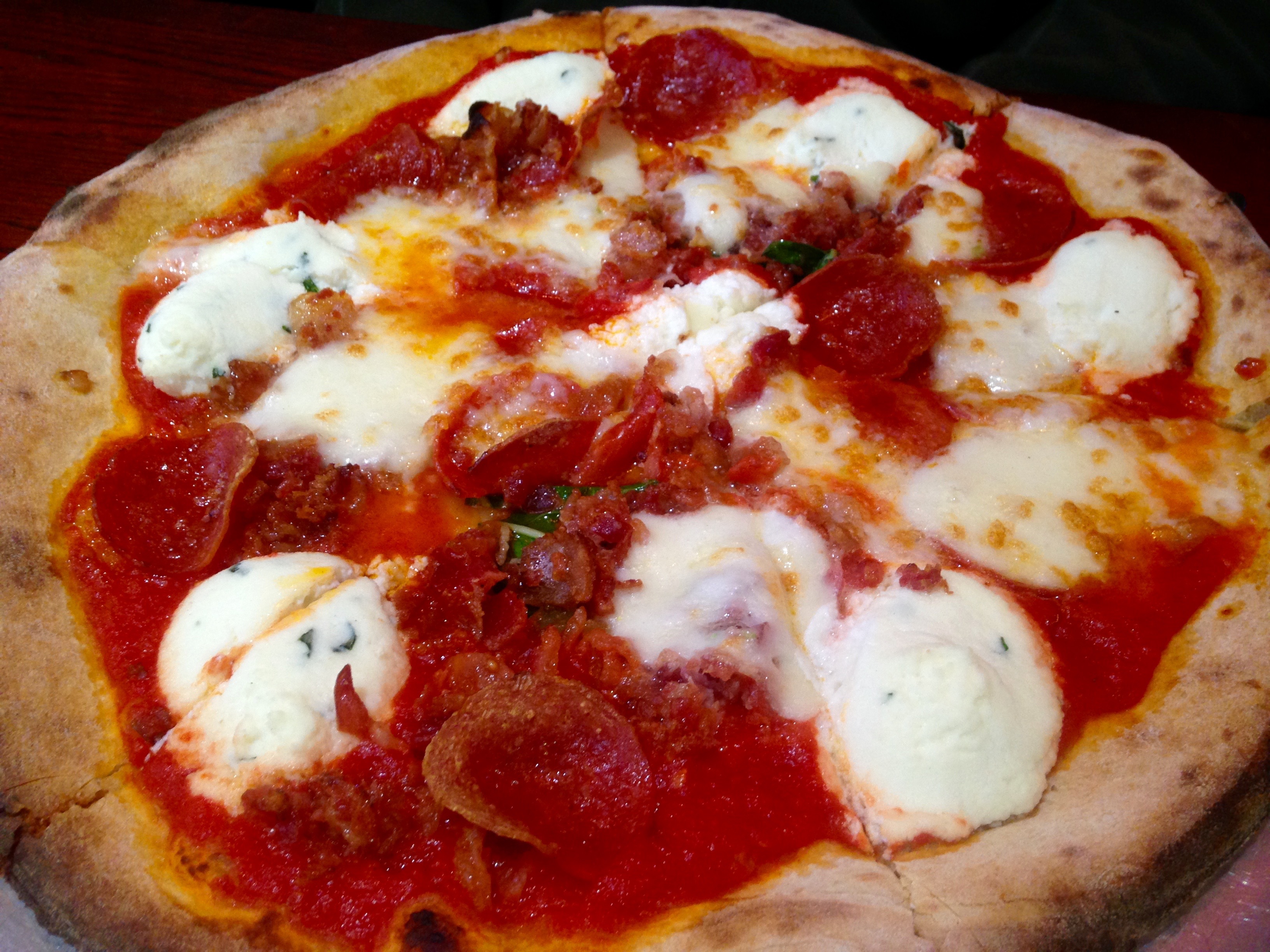 That’s the name of Charlie’s pizza. It’s got pepperoni, bacon and ricotta. The pizza dough at Real Fix is made from the proper Double Zero flour and is leavened for at least 96 hours before it’s made. They use a mother dough that’s 15 years old. Imagine having the responsibility of taking care of the mother dough. Anyway, you will notice this crust. When it’s cooked in those wood-fired ovens, you get an incredible pizza. My pizza is the “5 Boroughs”.