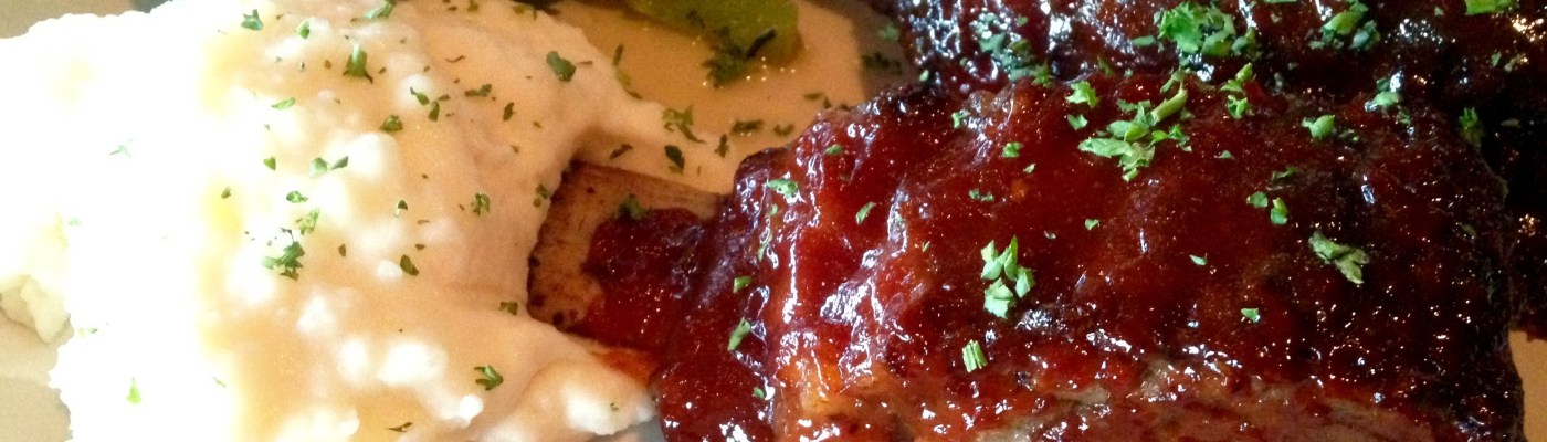There’s a lot of meat on the two ribs. It’s cooked more like a short rib with BBQ sauce. The meat is slow-roasted and very soft. The sides are mashed taters and broccoli. Sometimes I can eat healthy. If they don’t have this as a special, there are also short ribs on the menu that probably taste a lot like these ribs.