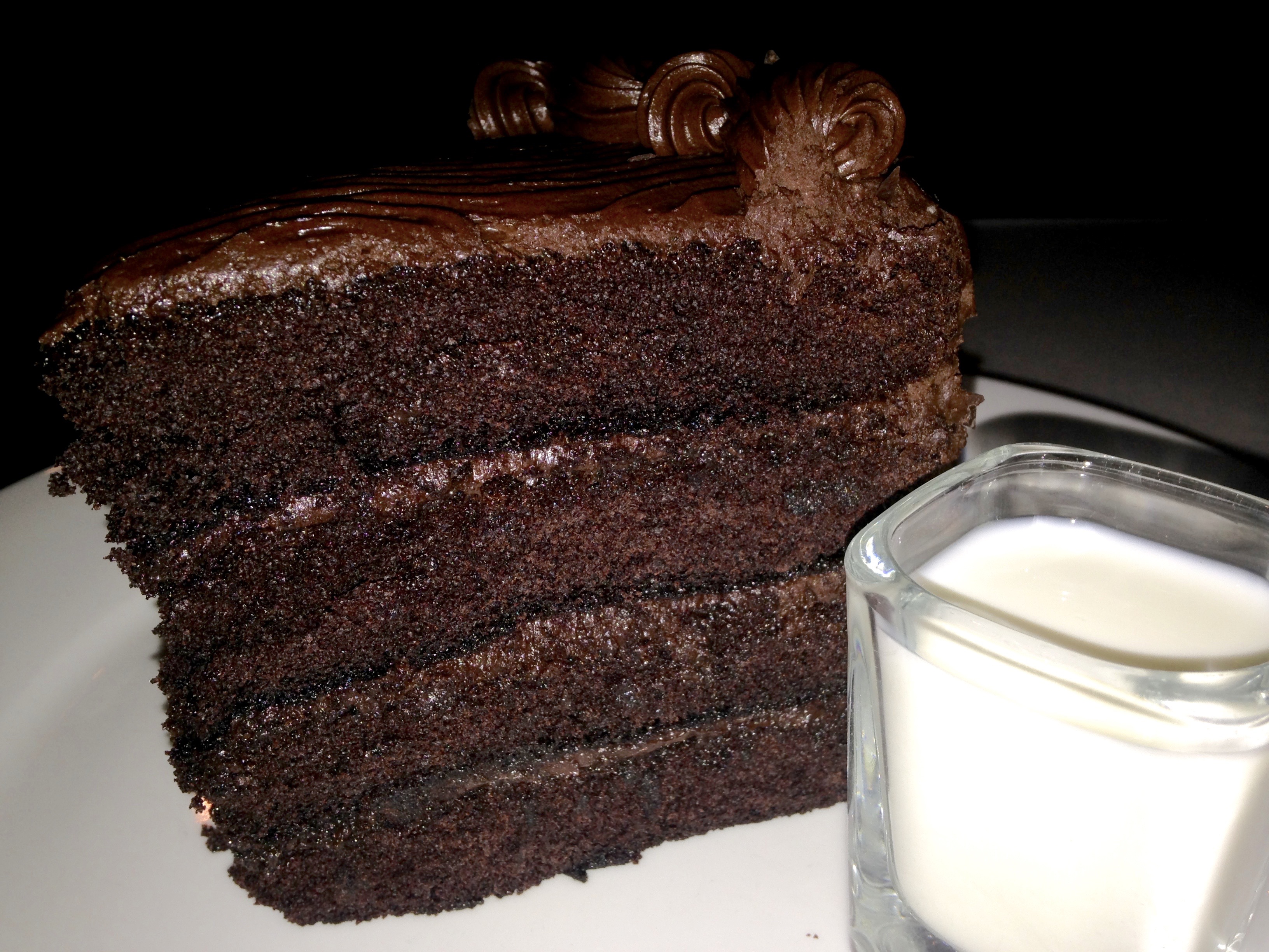 The cake is moist and full of chocolate, which is exactly what we want tonight. Here’s a nice touch–it comes with two “shots” of milk to wash it down with. This makes the cake even better. By the way, we eat about half of the cake and take the rest home for dessert the next day.