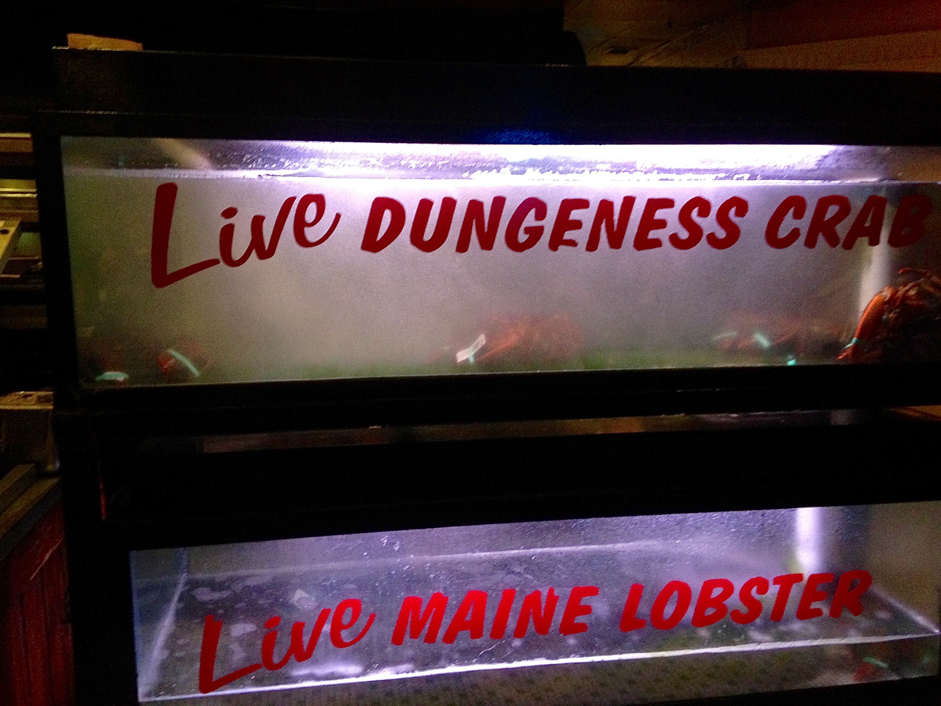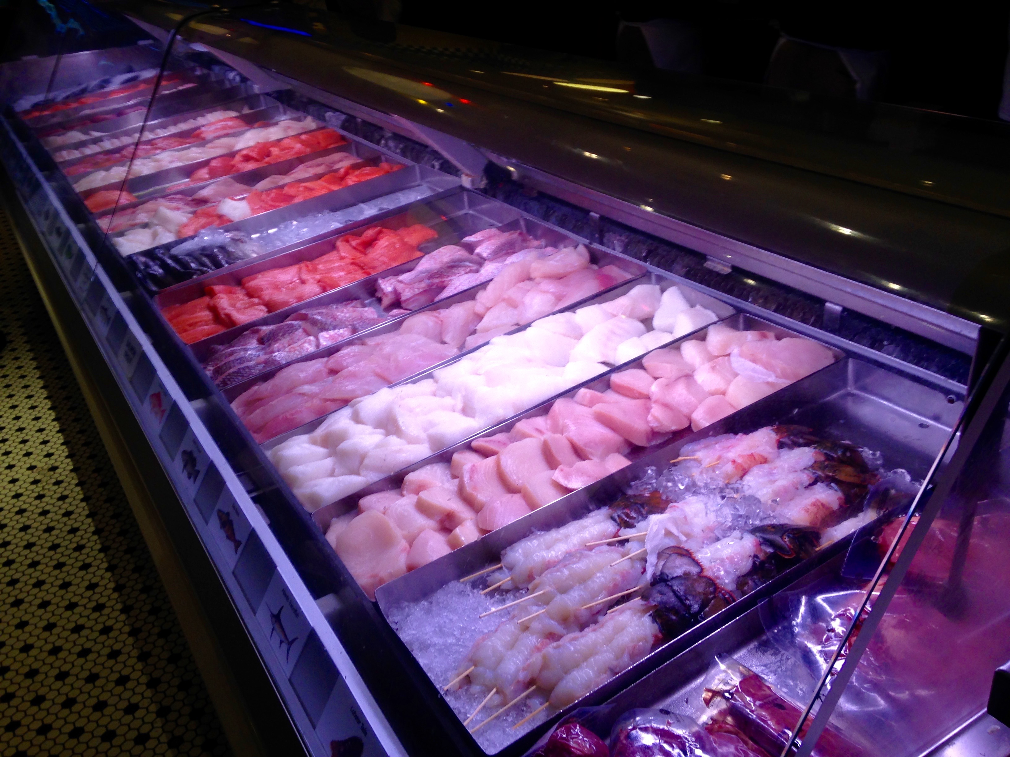 We arrive on time for our 6:30 dinner reservation. Date Night tip: don’t even think about going here without a reserved table. Unless you like to wait, of course. With all of these people, they are behind and we get seated after about a fifteen-minute wait. While we wait, we study the seafood refrigerator.