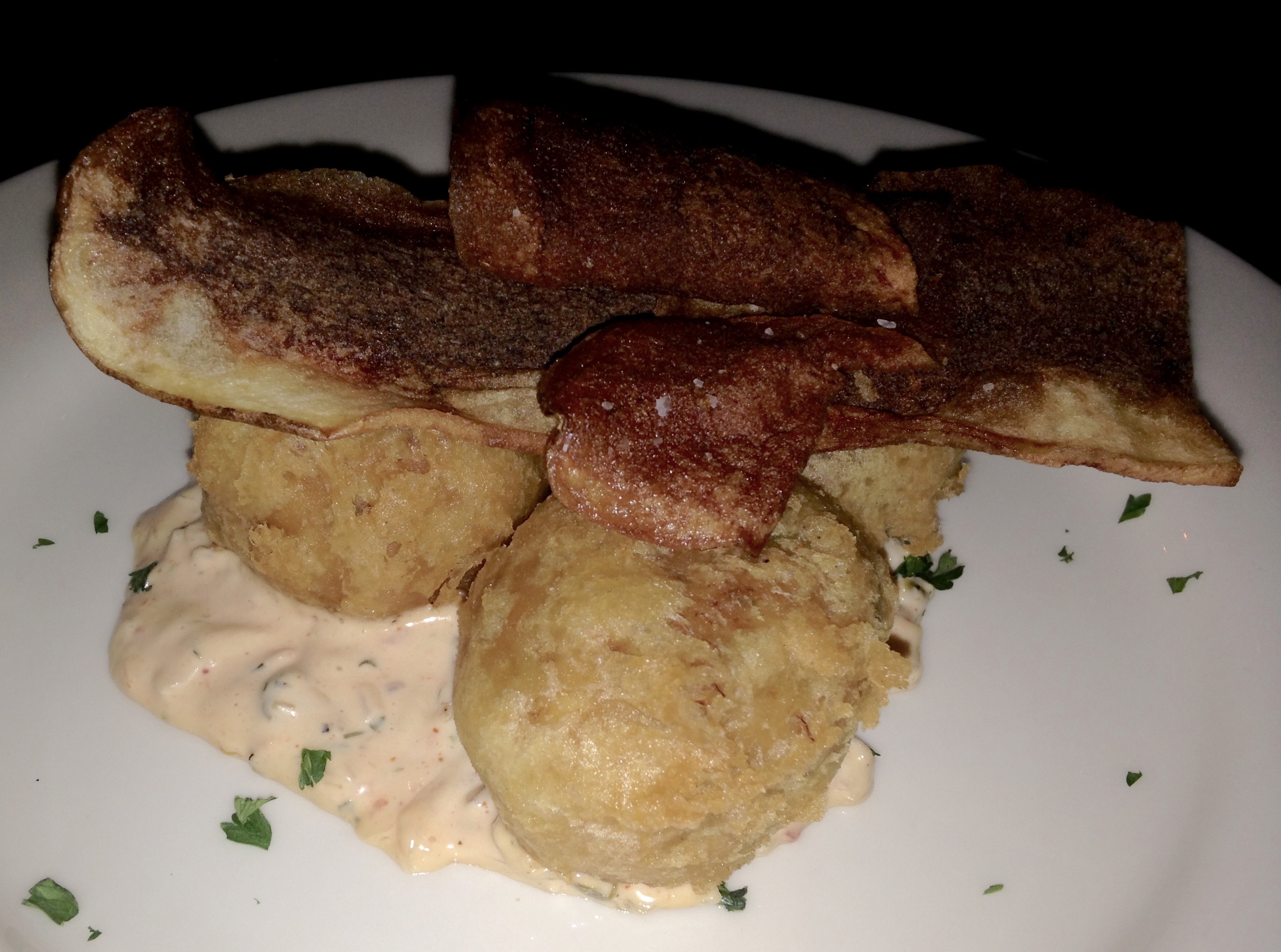 The jumbo lump crab fritters are the first thing we share. It always happens that you get an odd number of fritters (3) when there are only two people. That’s OK–we know how to cut one in half. These are excellent fritters and taste a lot like some of the stuffing that we get in our shared entree.