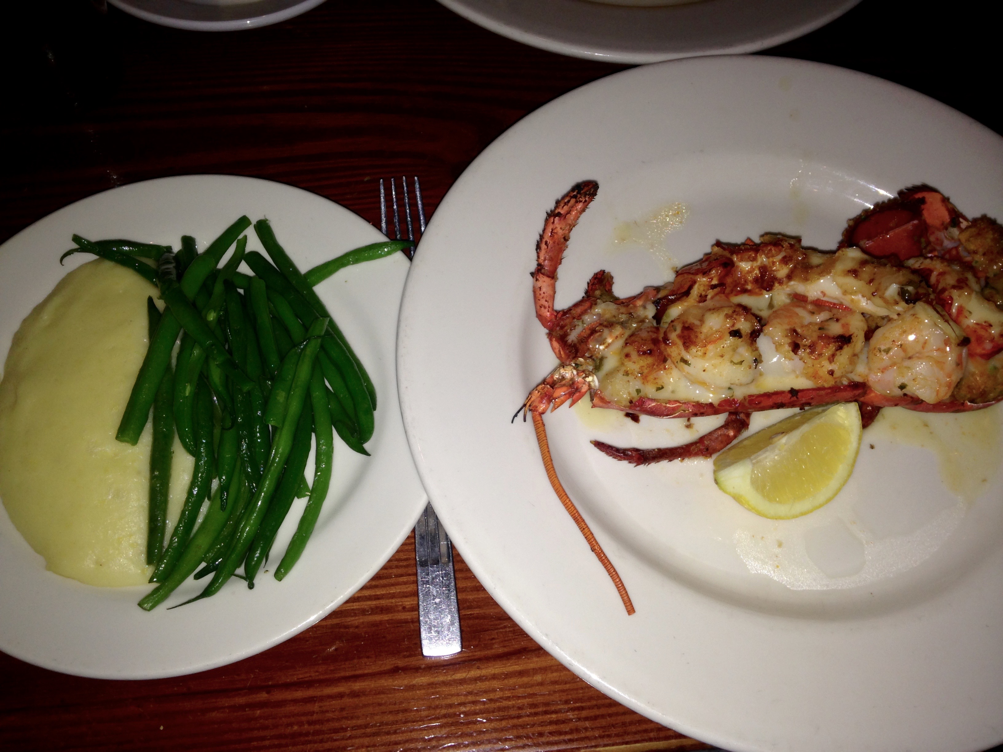 Don’t go here and order anything except seafood. From cod to tuna, they have it all. I don’t know how you could make a wrong choice. The combo platters look good, but we decide to share the special, which is a lobster stuffed with shrimp, crab, and scallops.