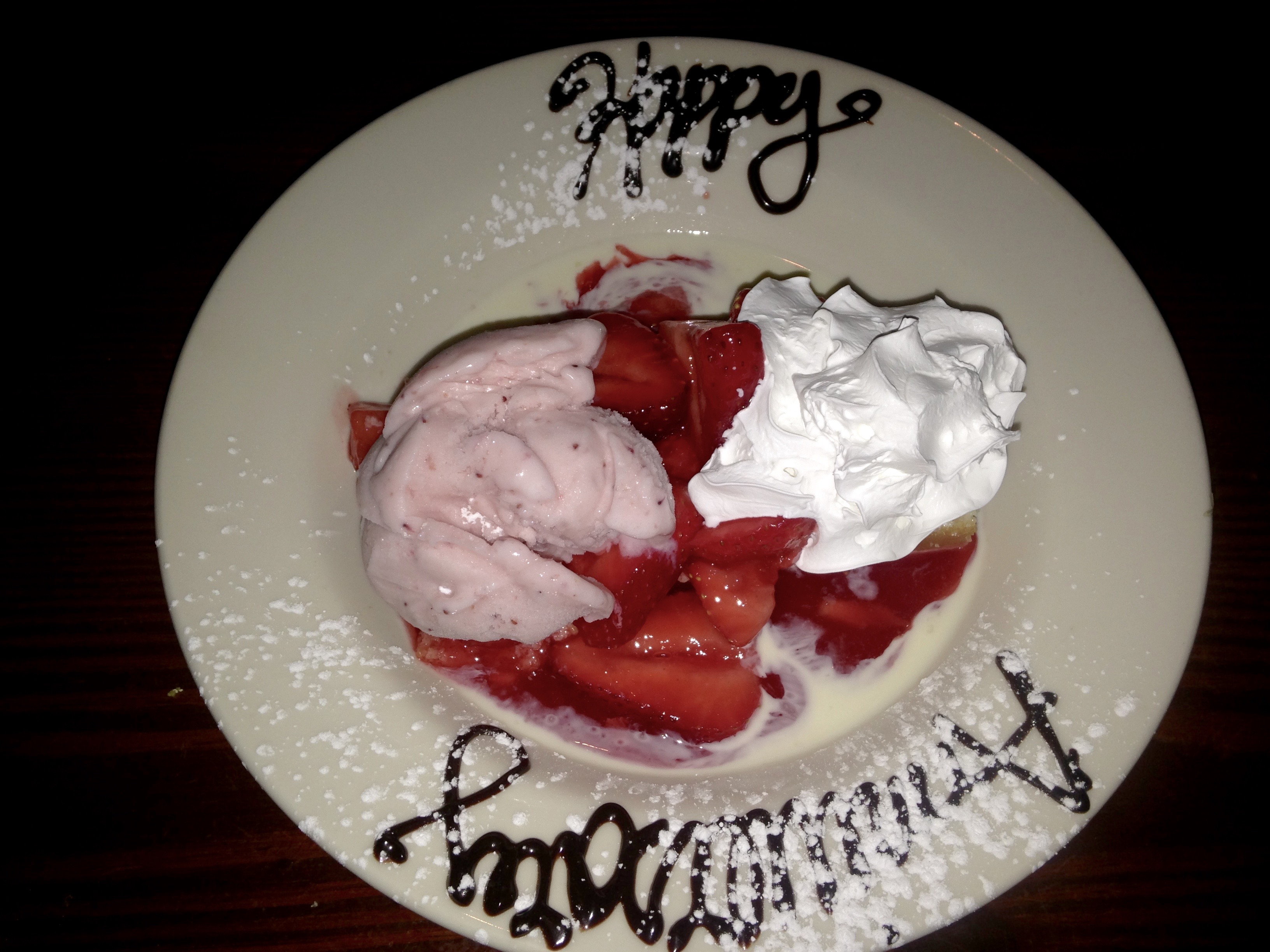 Since it’s our anniversary, we splurge and wind up with two desserts. So much for that healthy entree. If you tell them you are celebrating a special occasion (and many around us are), they bring you a strawberry shortcake.
