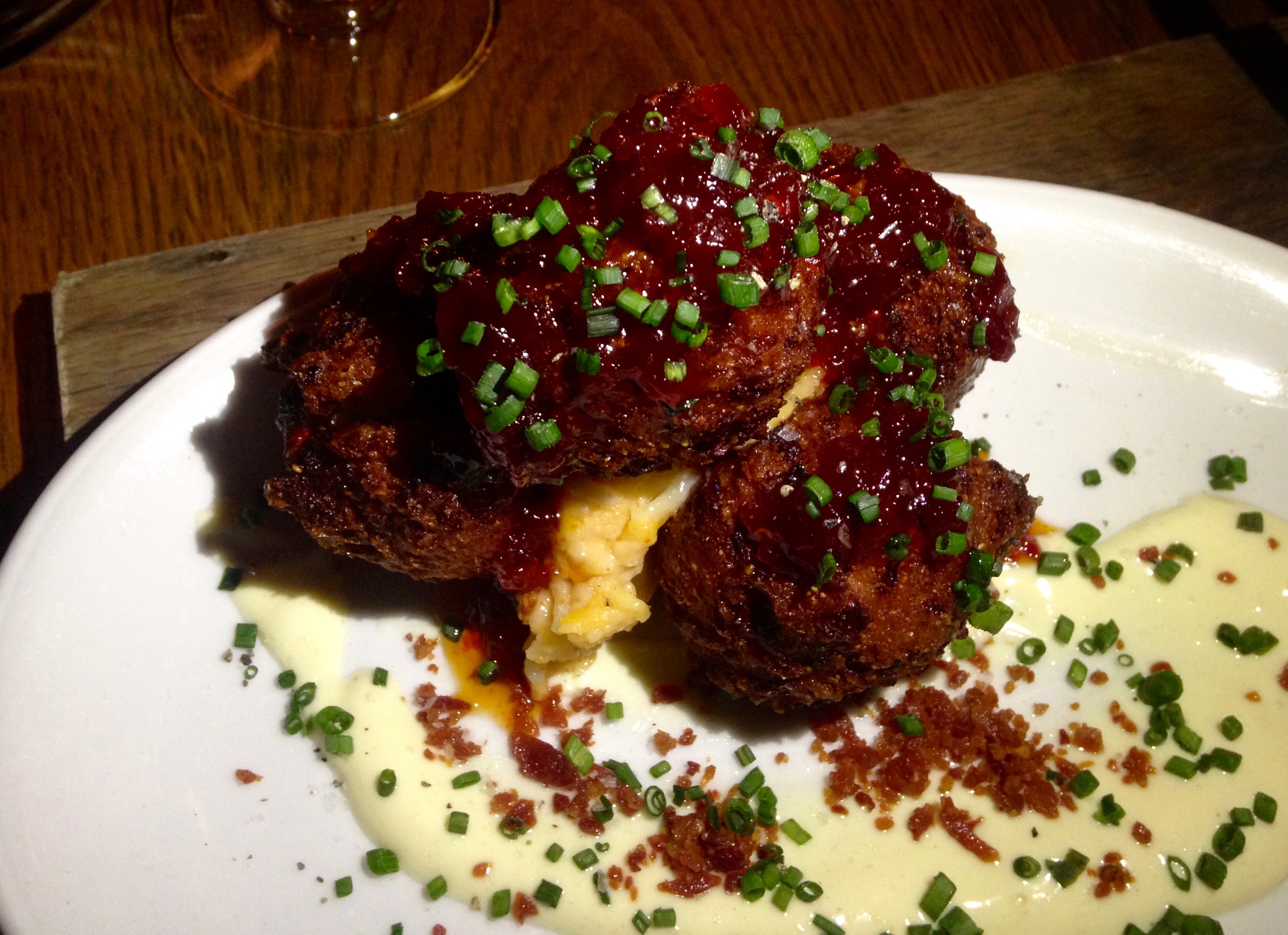 The pimento cheese hushpuppies have a little kick from the sweet pepper jelly that is drizzled on top. The cheese goes perfectly with the fried balls of corn meal. This is a fun twist on a southern staple.