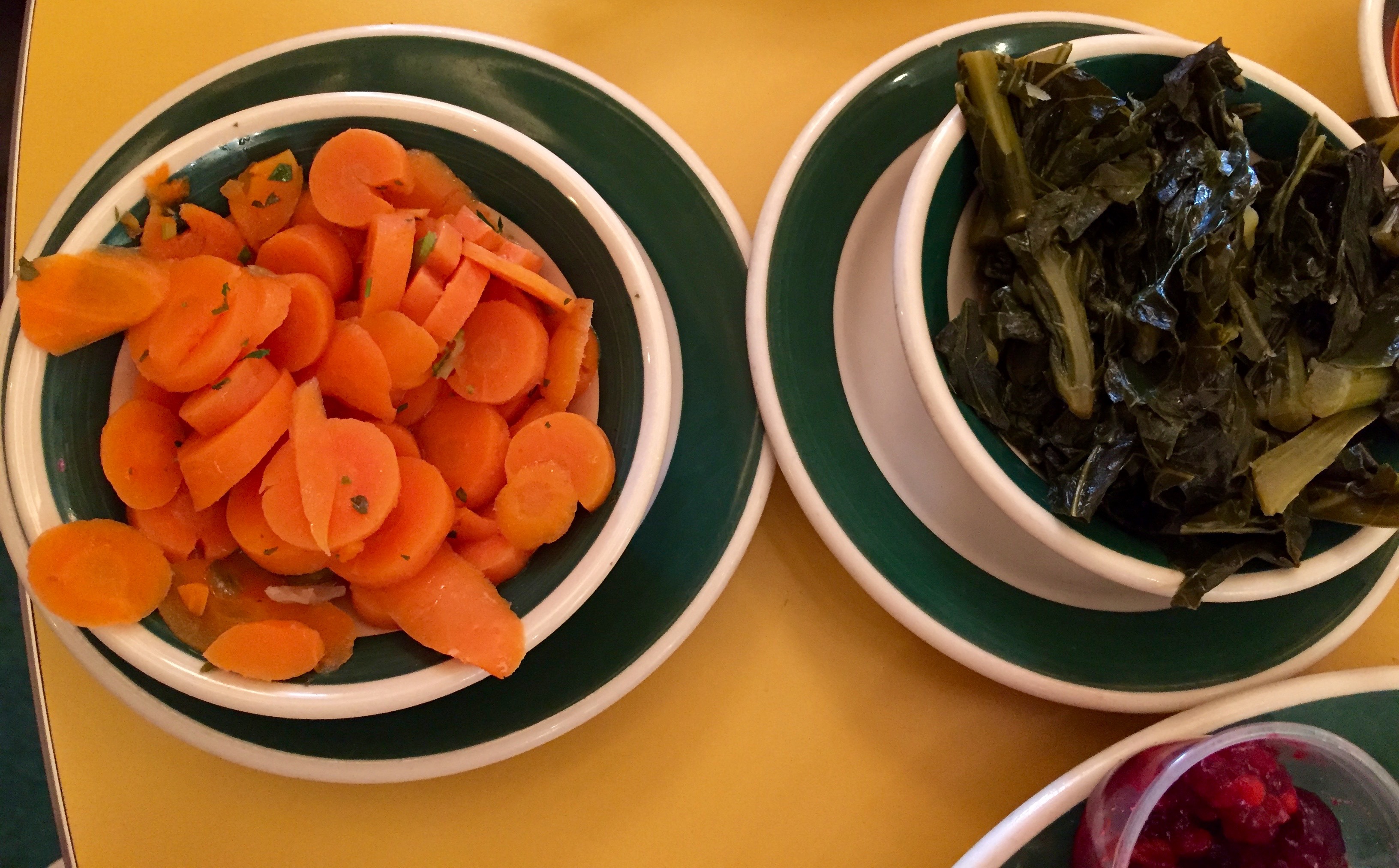 The turkey is nice and moist and comes with all sorts of sides, like carrots and collards.