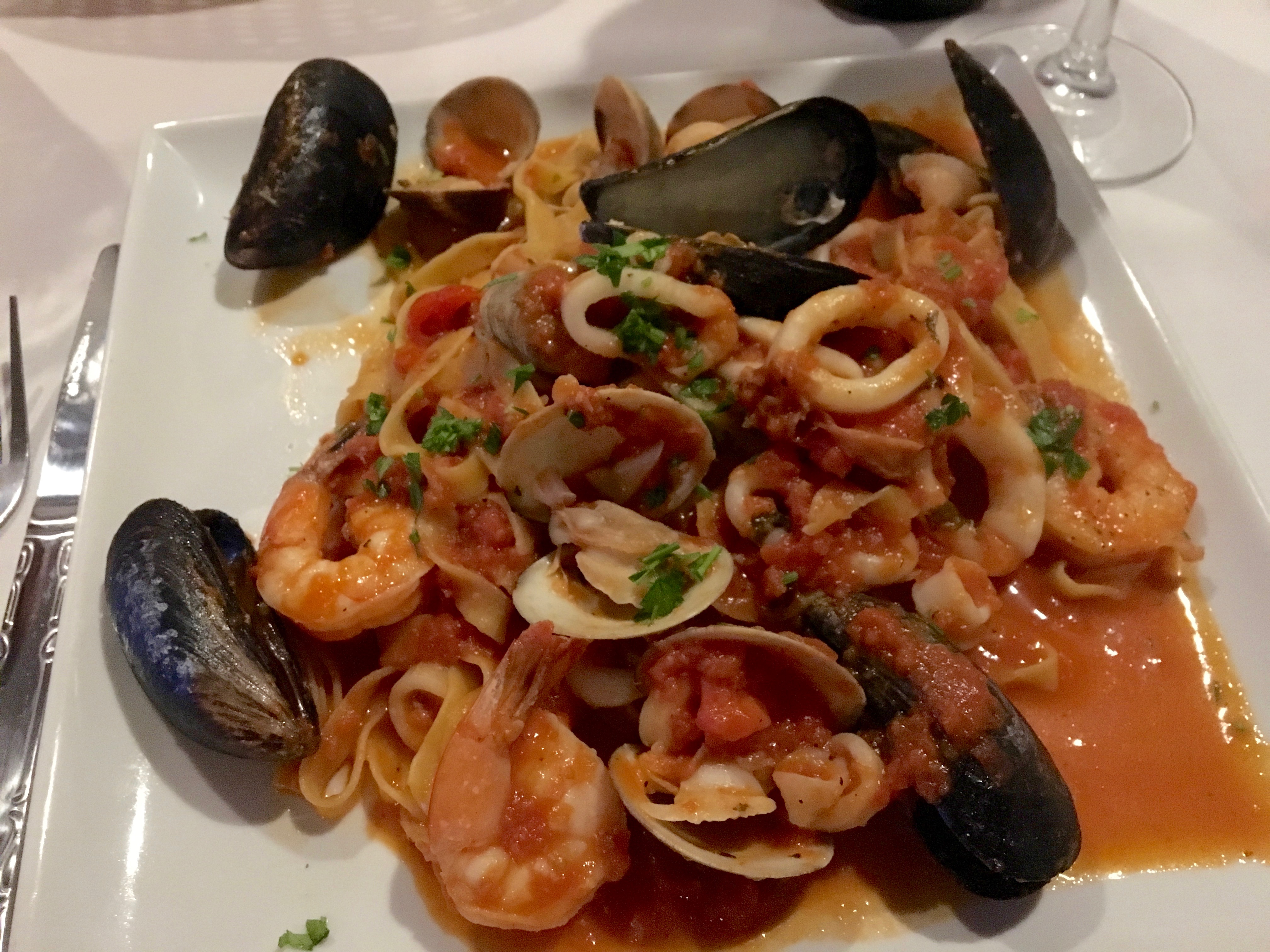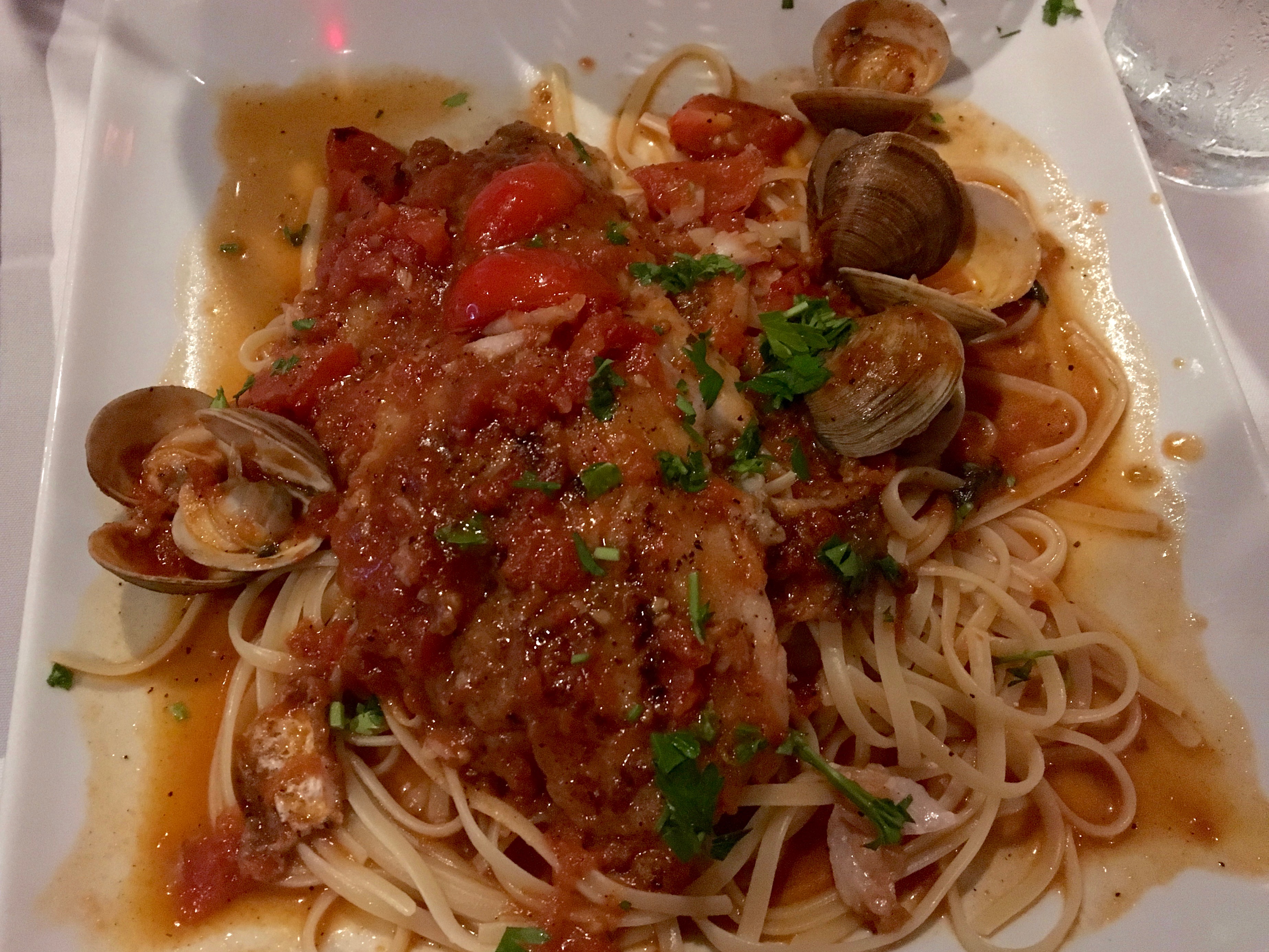 Linguini and clams is Eve’s go-to Italian treat. It’s pretty similar to my dish, but she does not get as much of a variety of seafood. This is another excellent plate of food.