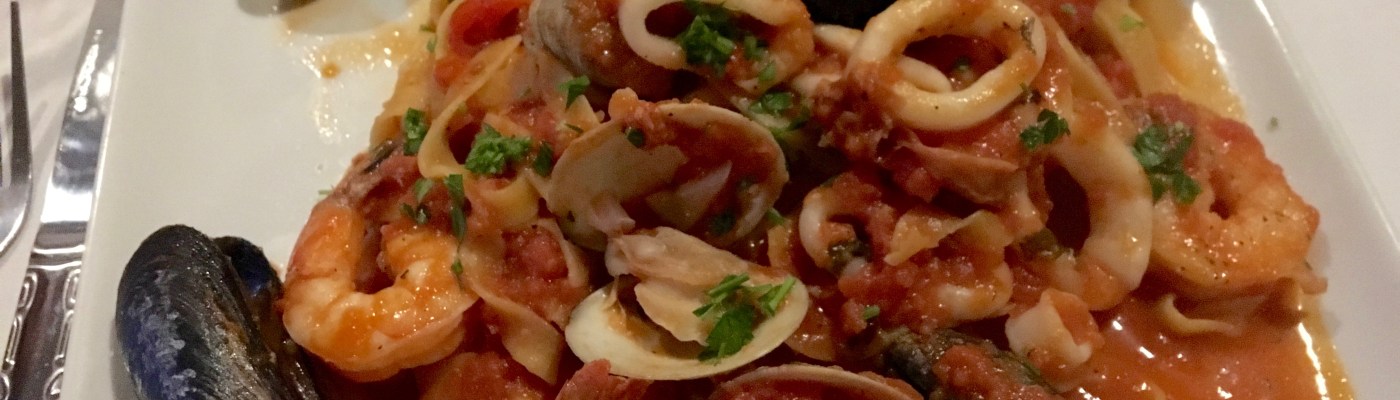 Fettuccine pescatore has all of the food groups. Fresh pasta, clams, mussels, calamari and shrimp are covered in a red tomato sauce. It’s served steaming hot. How do they get the noodles to keep the heat? Anyway, the two of us who order this are very happy campers.