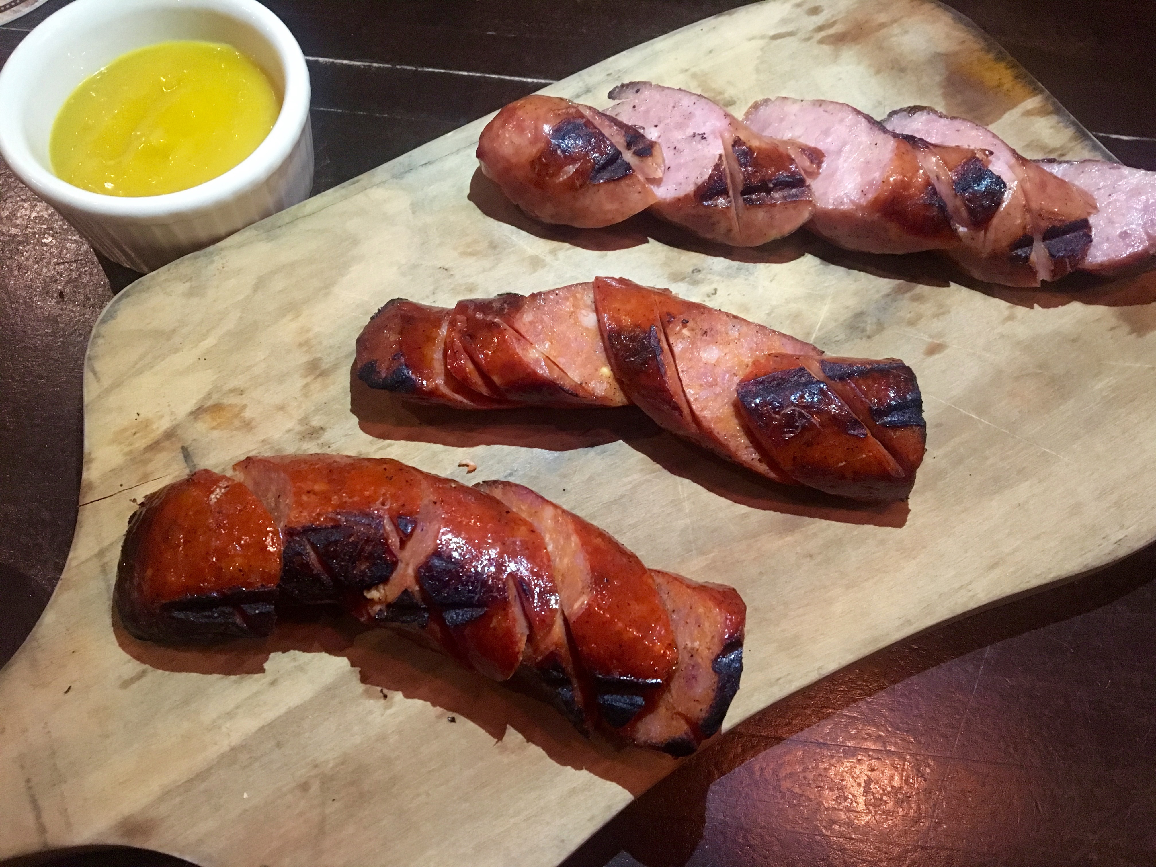 There are three kinds of local sausage on the platter: andouille, bratwurst, and kielbasa. All are grilled, plump and juicy. This is an excellent dish to share with four people, two more than we have at our table tonight. The sausages are huge and we take some home and put them into pasta for lunch the next day.