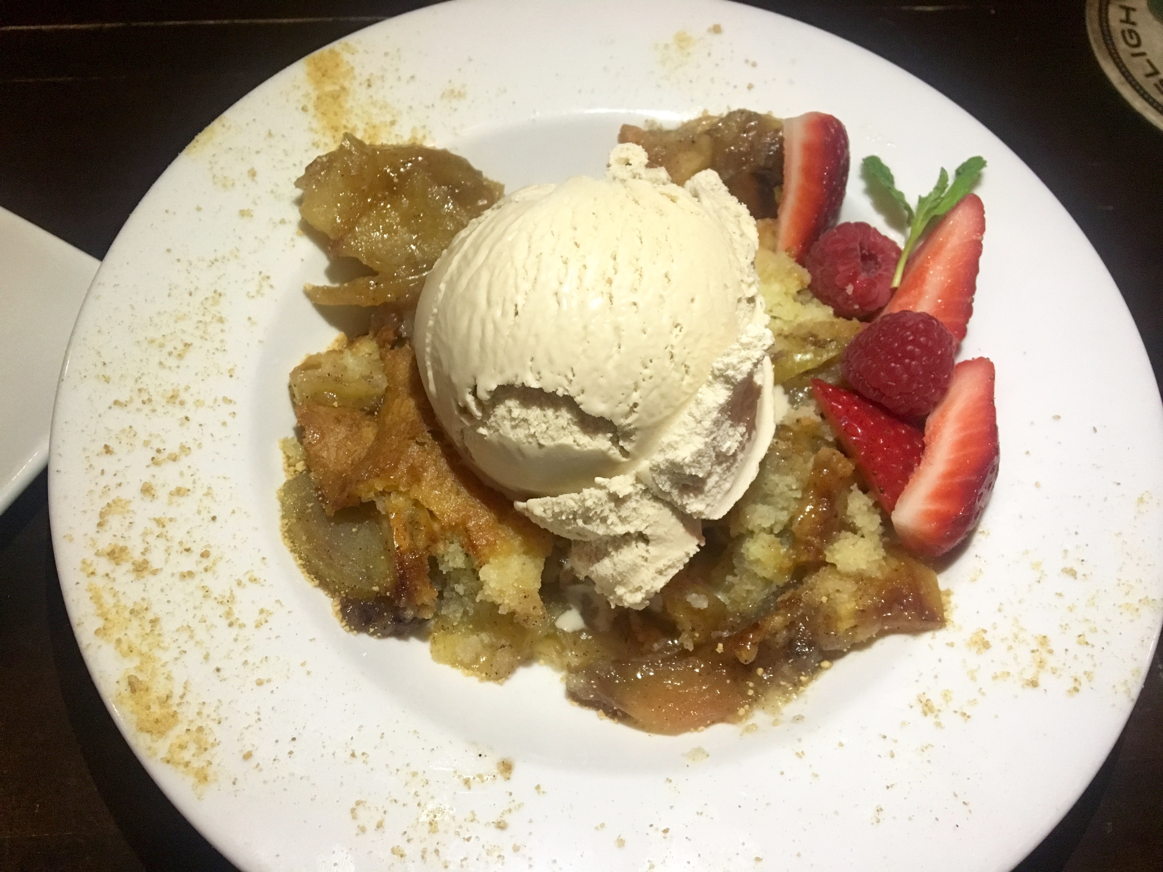 Speaking of topping, it’s served with a huge scoop of cinnamon ice cream on top. There isn’t that much cobbler underneath and we are left wanting more cobbler and less ice cream.