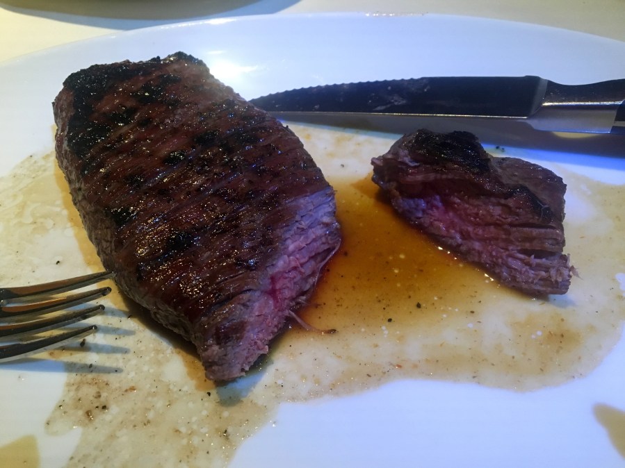 Flank steak is a bit chewy, so we won’t complain about that. It’s very tasty, but if you don’t like to masticate in public, you may want to order something more tender, like the drop cut ribeye.