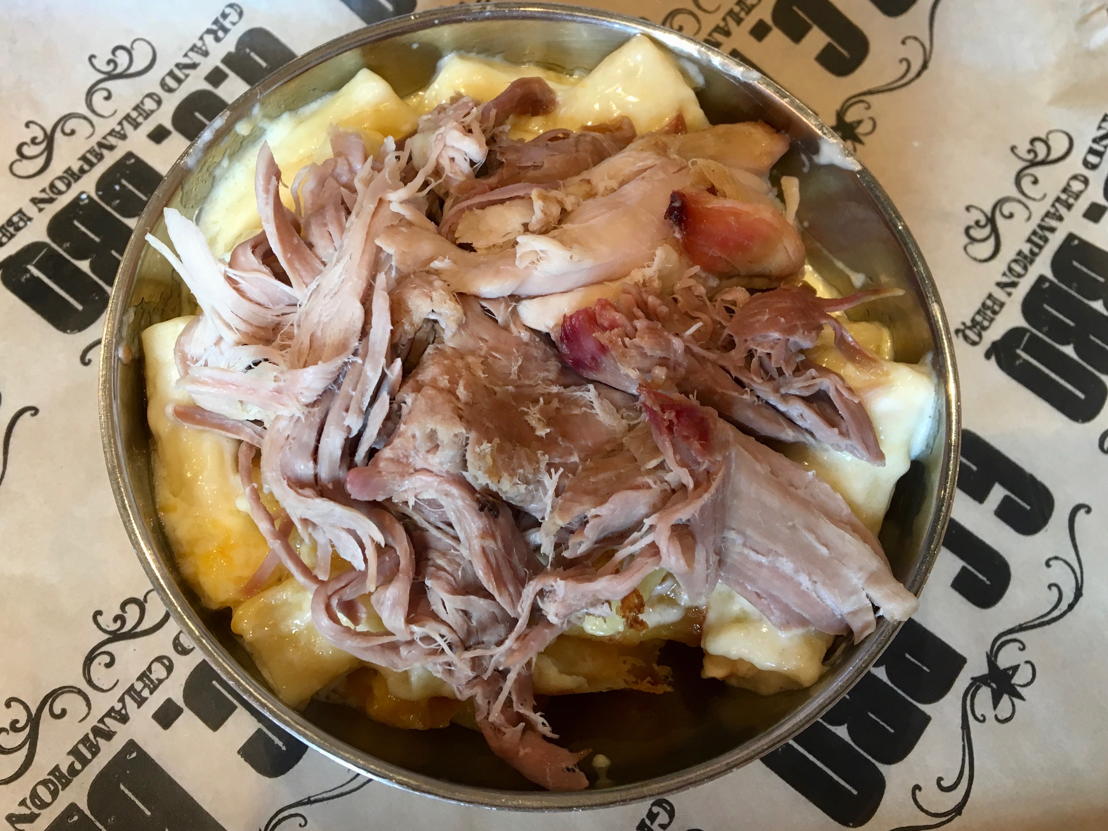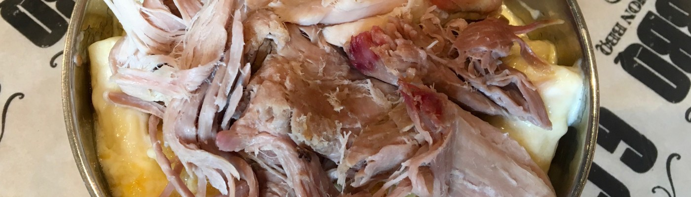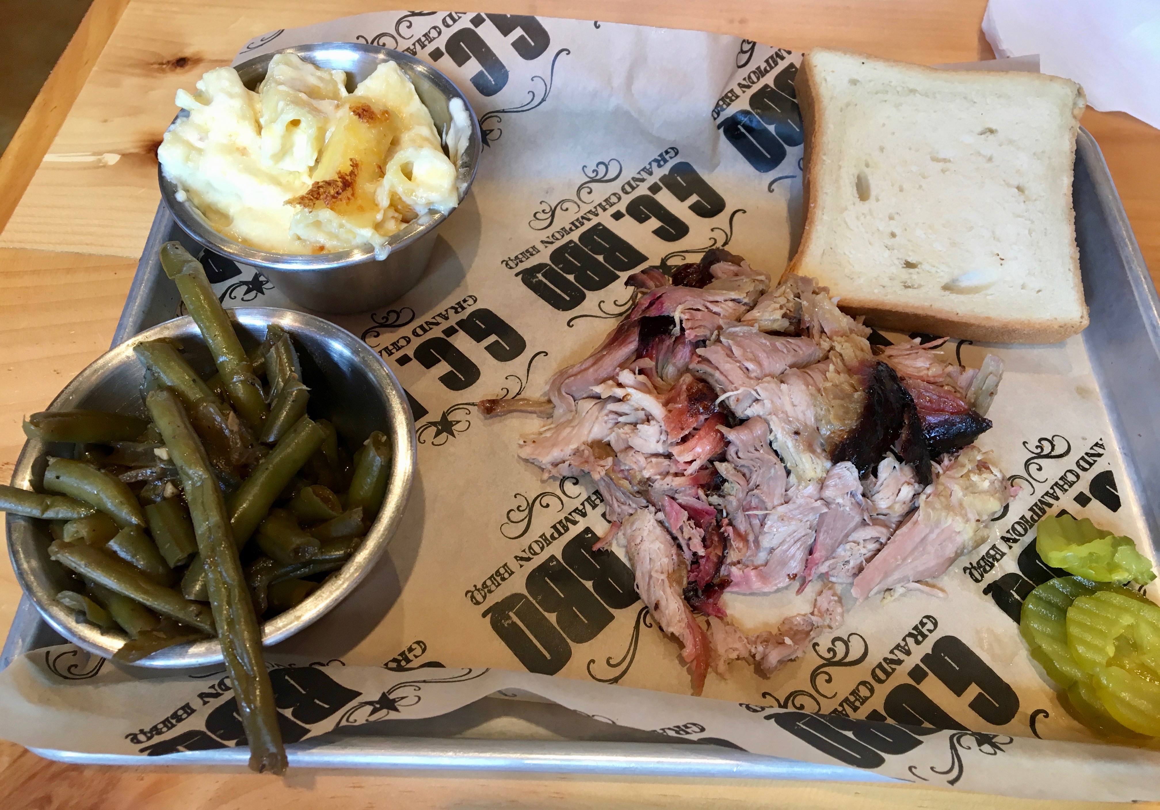 GC takes their “award winning” macaroni and cheese and tops it with the meat of your choice. Bev tops it with the pork. The mac and cheese is excellent, and topping it with pork only makes things better. The rest of us go more conventional and get the plates with two sides. Here’s more pork.