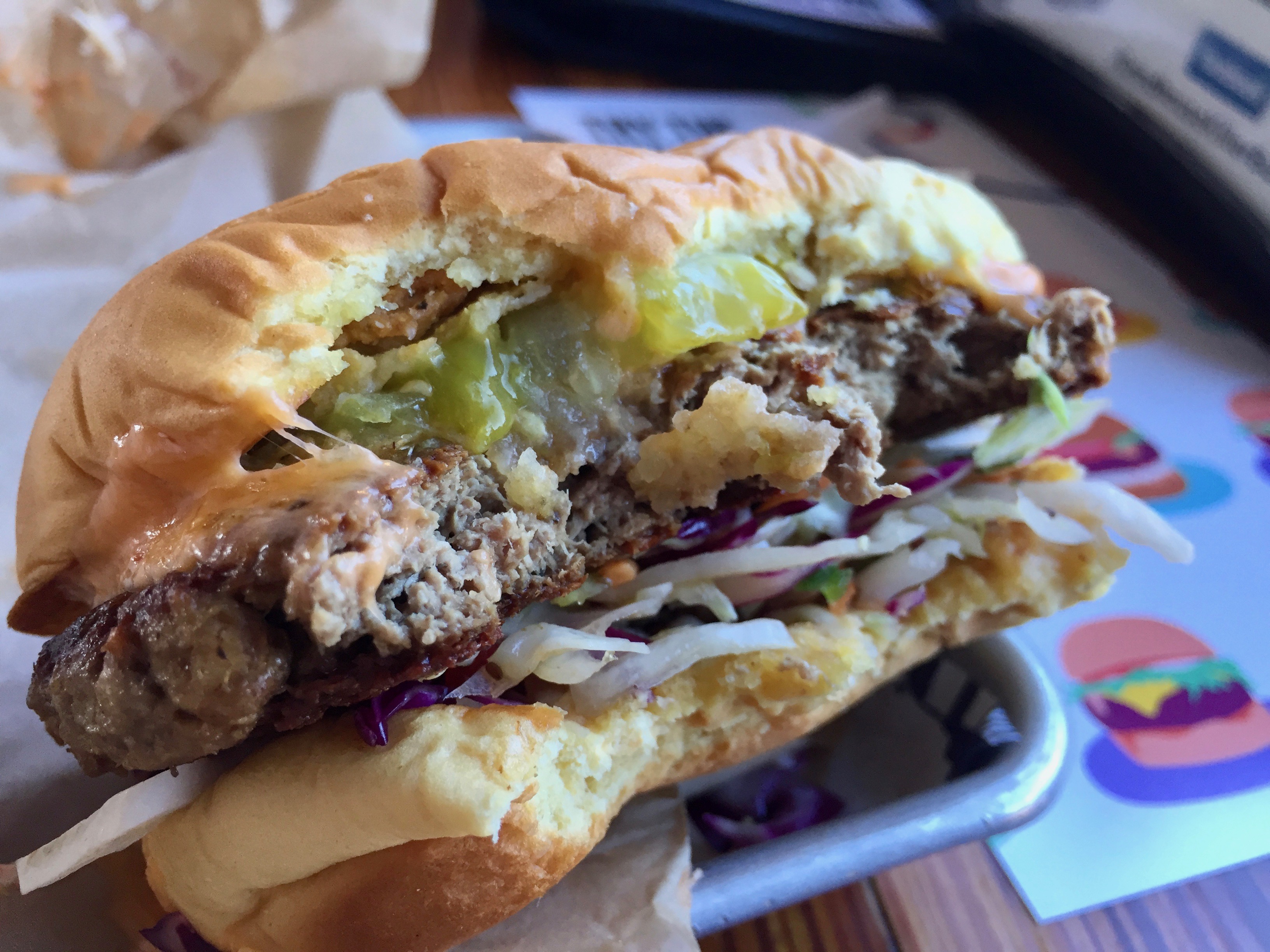 Well, if I told you that was meat in that bun, you would probably believe me from the visual perspective. This is the “Dixie Style” burger with fried green tomato, slaw and pimiento cheese. So it looks like a burger. It also has the texture of meat. No soggy bean burger here. But most importantly, does it taste like a burger?