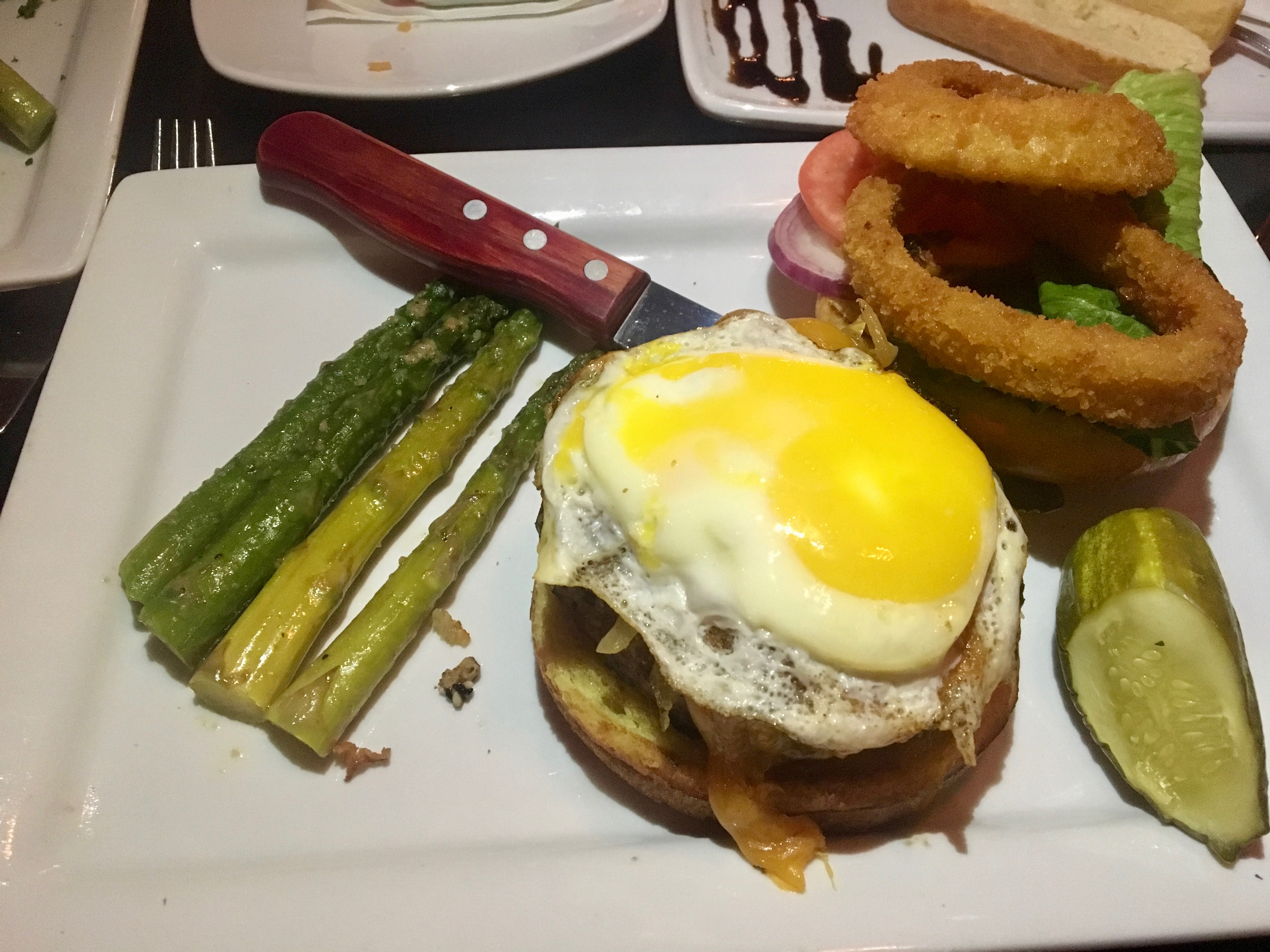 What they get is the Tavern Cheeseburger, which has fried egg and a mushroom/onion mix on it. It’s not what they ordered and point it out to our server. He offers to bring them the right thing. Not wanting to waste food, they decide to eat it, but ask for some avocado (part of their original order) to put on top. It never comes. Eve’s burger should have been medium, but is rare and bloody. She probably should have sent it back for more cooking, but you reach a certain point where you just want to eat.