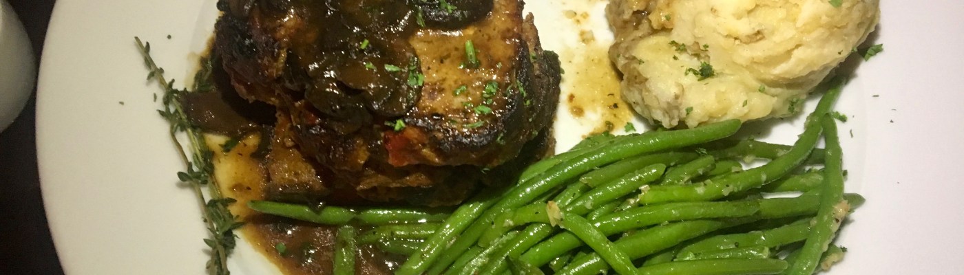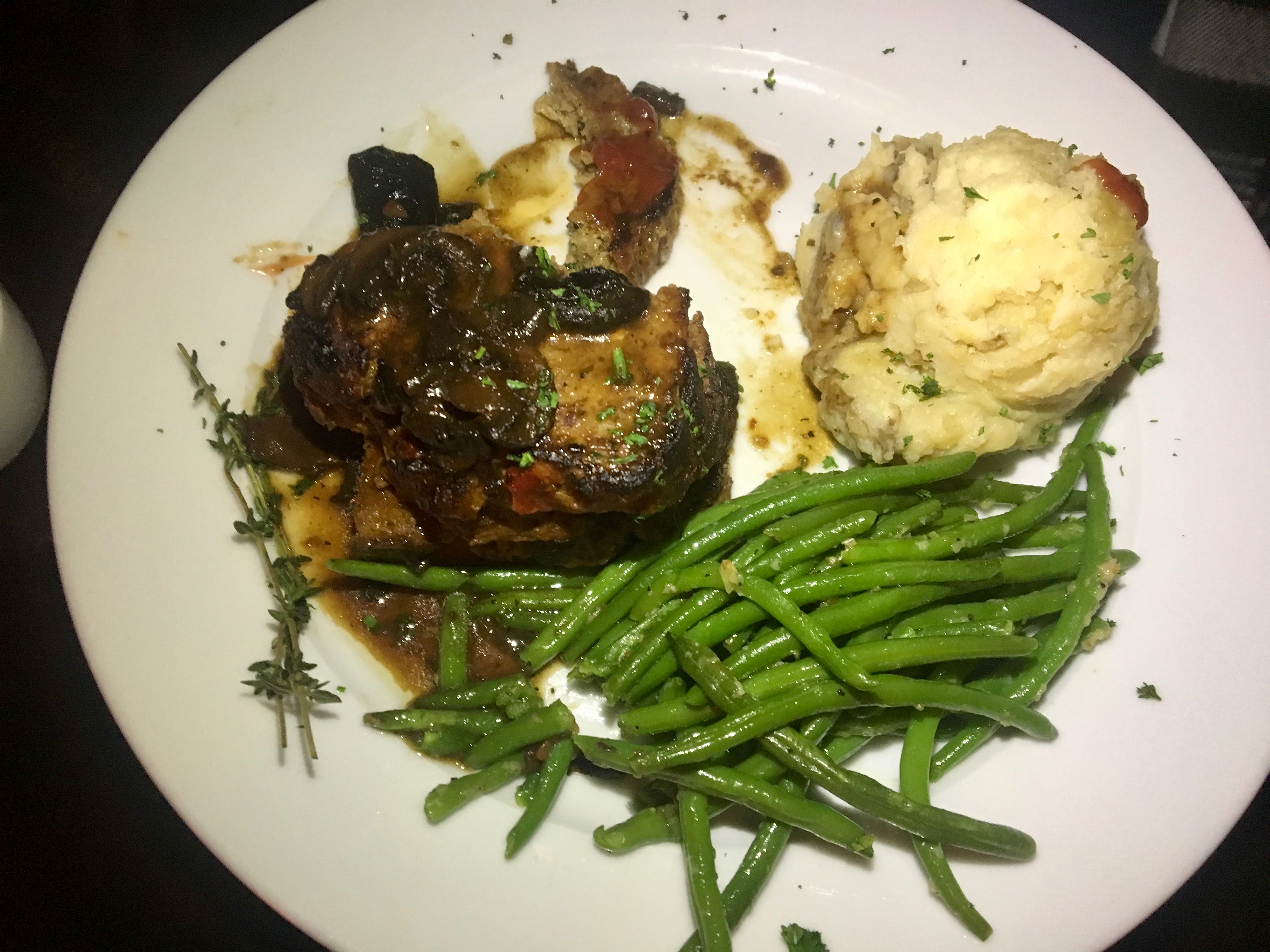 My plate arrives with asparagus and green beans and no potatoes. Go figure. The loaf is veal, pork and Angus beef and is pretty good. There’s enough for lunch the next day. I bet those potatoes were good too, but I will never know.
