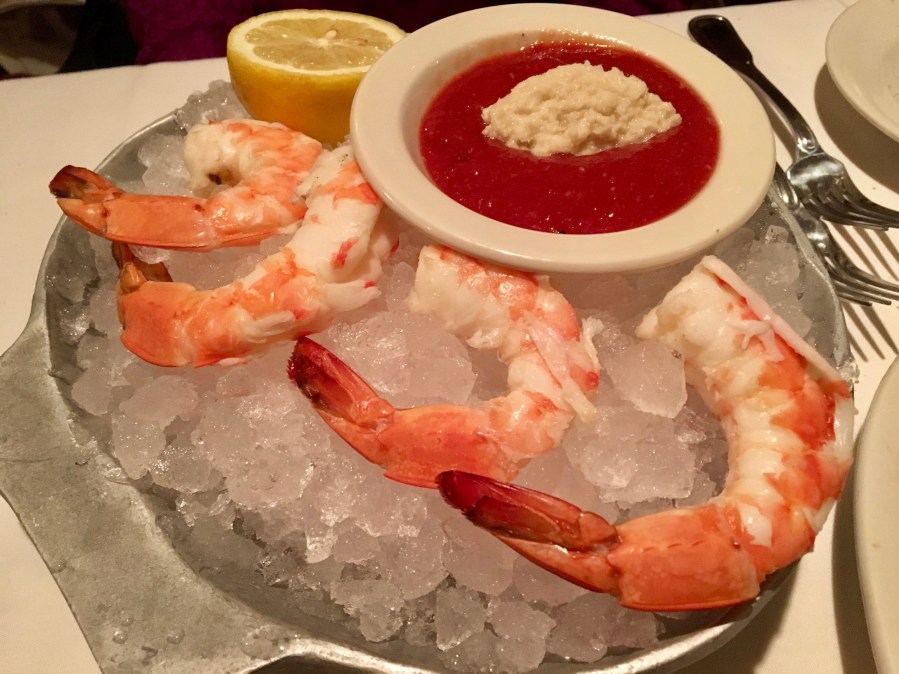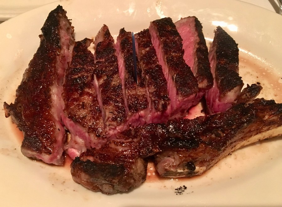 There is nothing small about these shrimp. They are fresh and cold and perfectly steamed. It’s the lowest-calorie dish we will have all night. We mentioned the steak, a rib-eye to be exact.