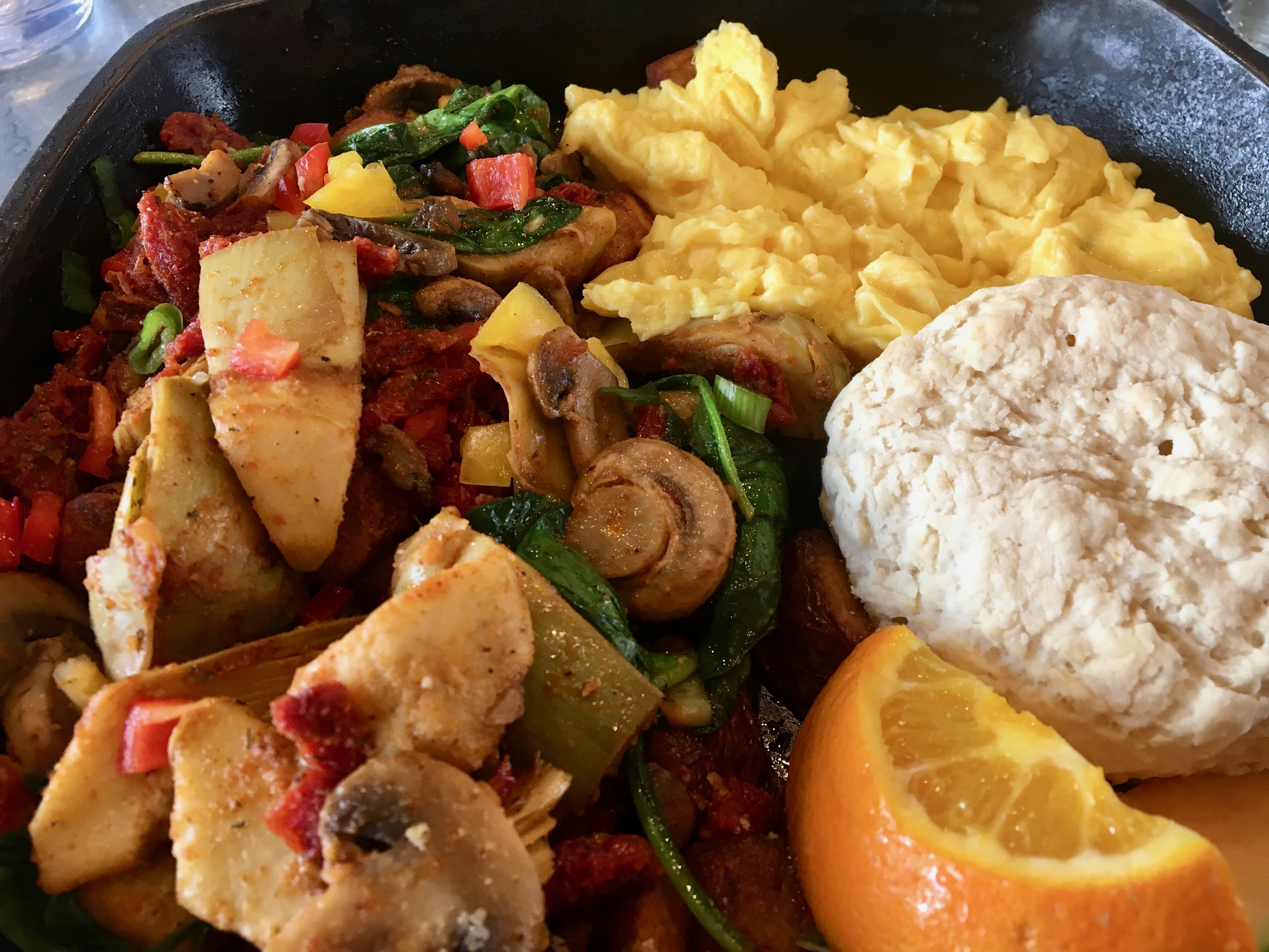 This hash features artichoke hearts, spinach, sun-dried tomatoes and mushrooms. I like the seasoning, which gives the hash a little kick. The scrambled eggs are nice and fluffy as is the biscuit. Southern biscuits are better than this one. It must be the water.