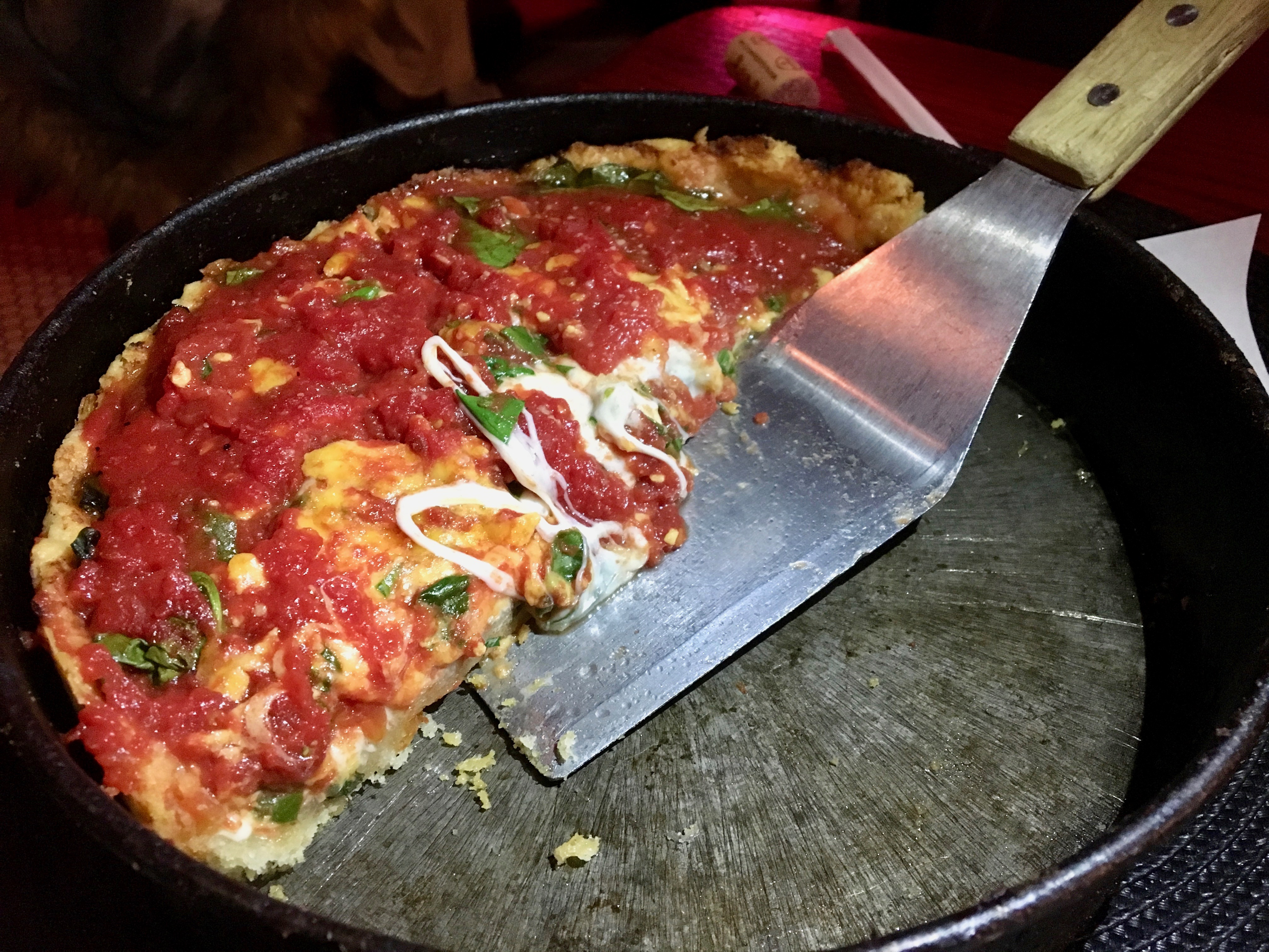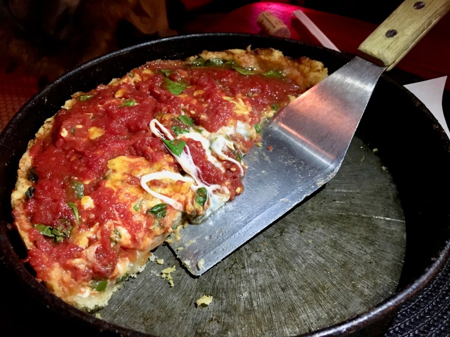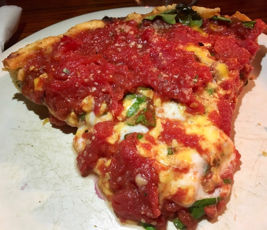 An interesting Chicago pizza feature is the cheese, which sits atop the thick crust and then gets covered with the chunky tomato sauce.