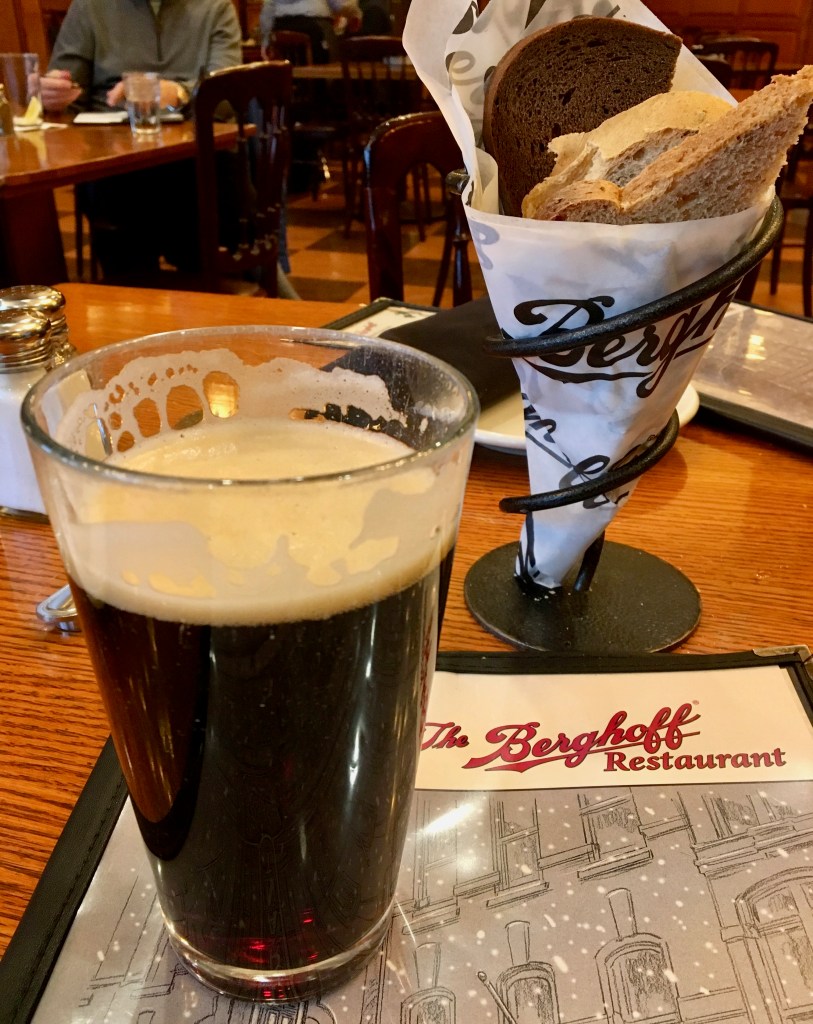 Imagine the party they had here when Prohibition ended in the early 1930’s. They have Ayinger Celebrator beer on the menu, one of my favorites. We don’t usually have beer at lunch, but what the heck–let’s share one.