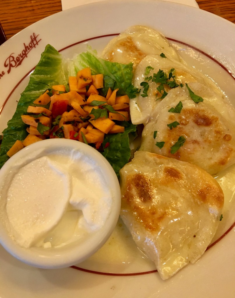And it pairs well with the bread basket they bring you before lunch. Pirogies are another Chicago favorite and we try the Berghoff potato version.