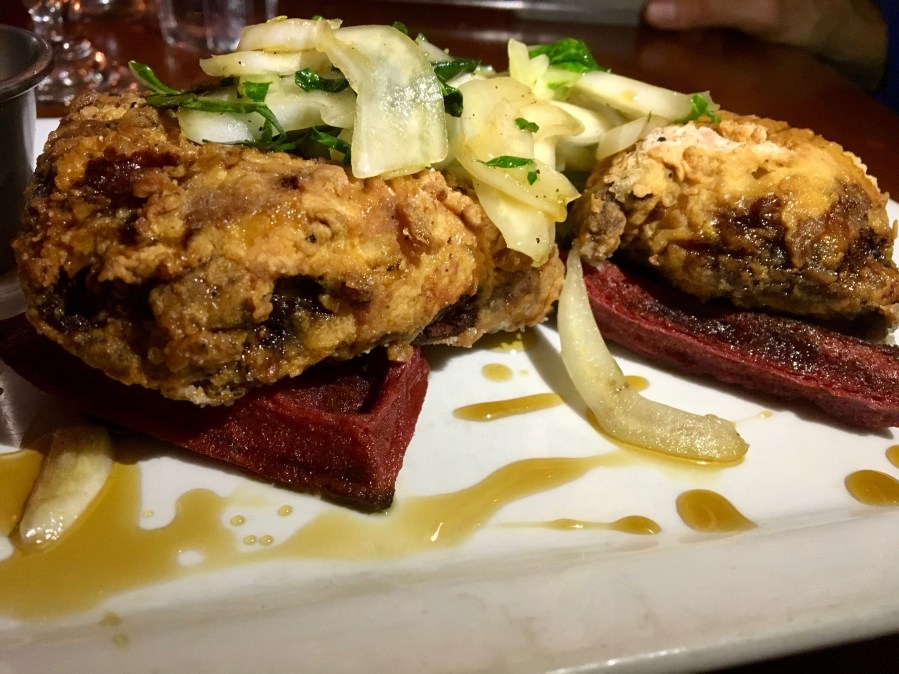 This chicken comes on a beet waffle and is covered in a bok choy slaw. The waffle gets a bit soggy, but the chicken is nice and crispy. Think about it…two southern food bloggers come to Chicago and wind up eating biscuits and fried chicken. Very strange.