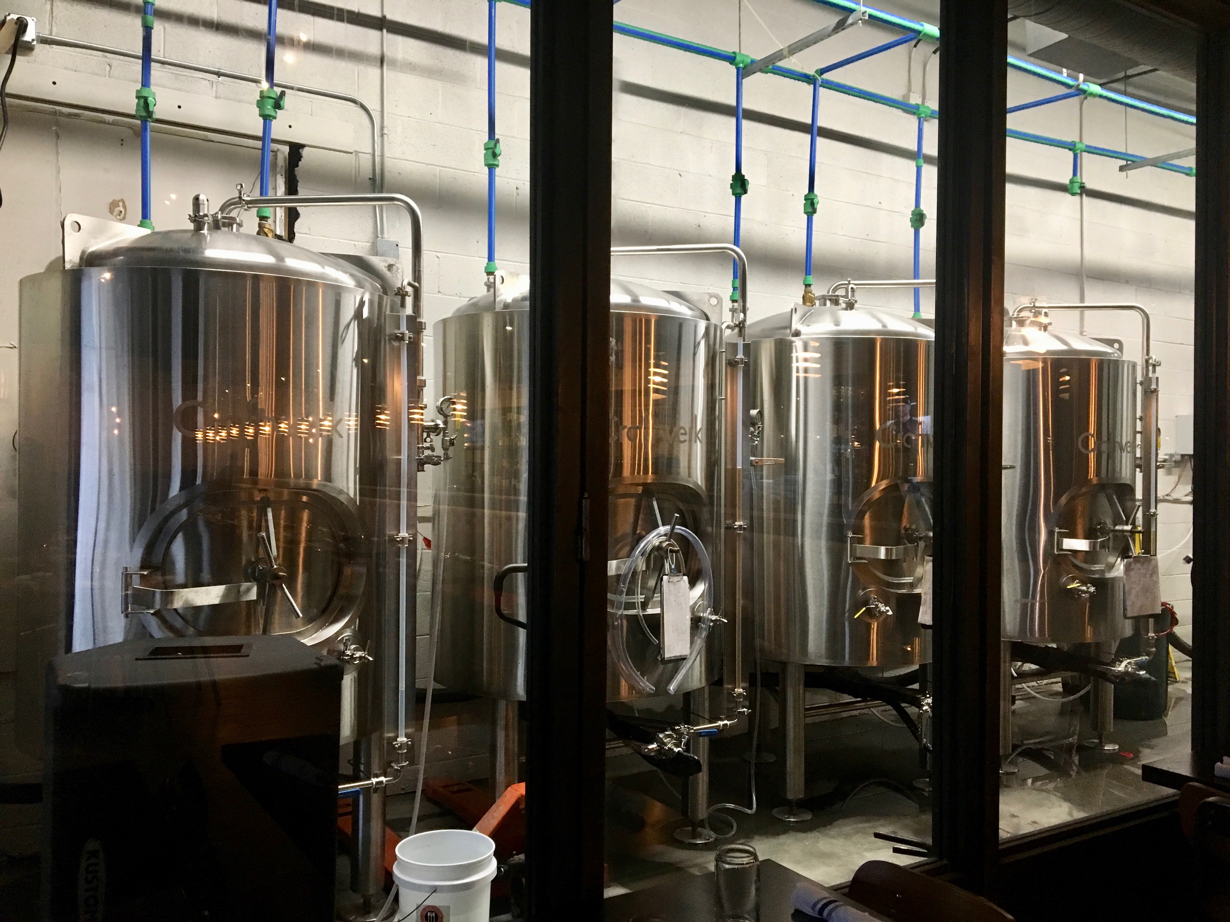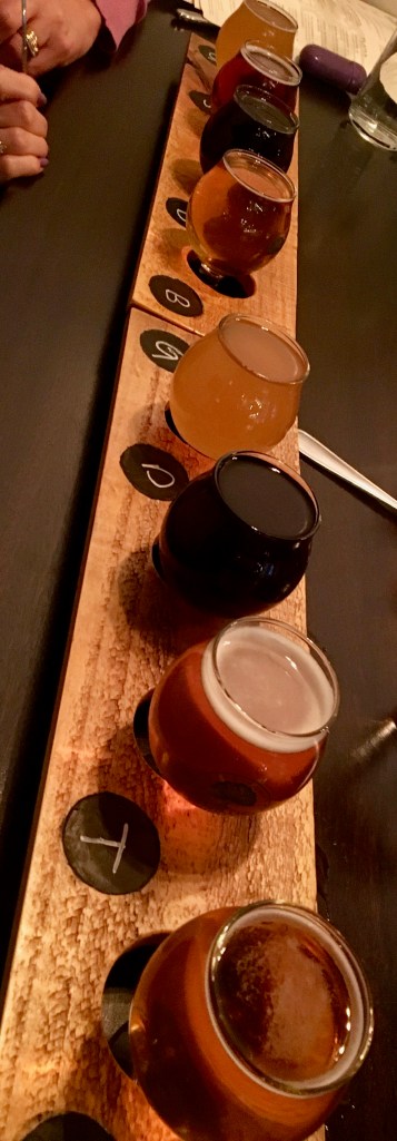 Our lesson for the night: it’s really hard to photograph two flights of beer next to each other. The beer selection rotates depending on what’s cooking in the kettle. We try almost every beer on the menu, even the triple IPA at 9.4%. For $9, it’s a great way to see what you like. I liked the Belgian Tripel the best. Eve liked the Golden Spiral Ale. They say these cute glasses are five ounce pours, but our guess is that they are really four ounces. Next time we are bringing a measuring cup.