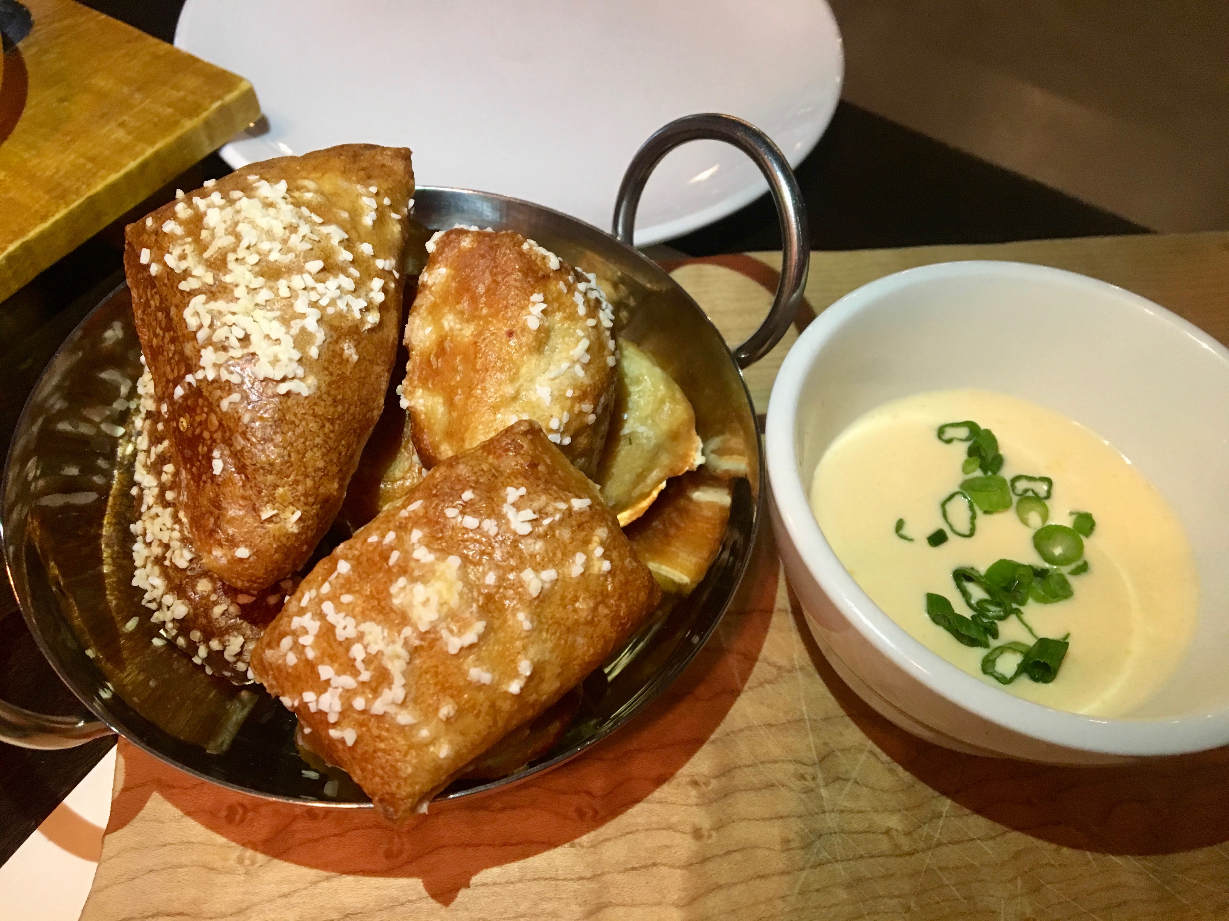 These come with IPA mustard-cheese sauce and are excellent. We like the different take on the pretzel shape.
