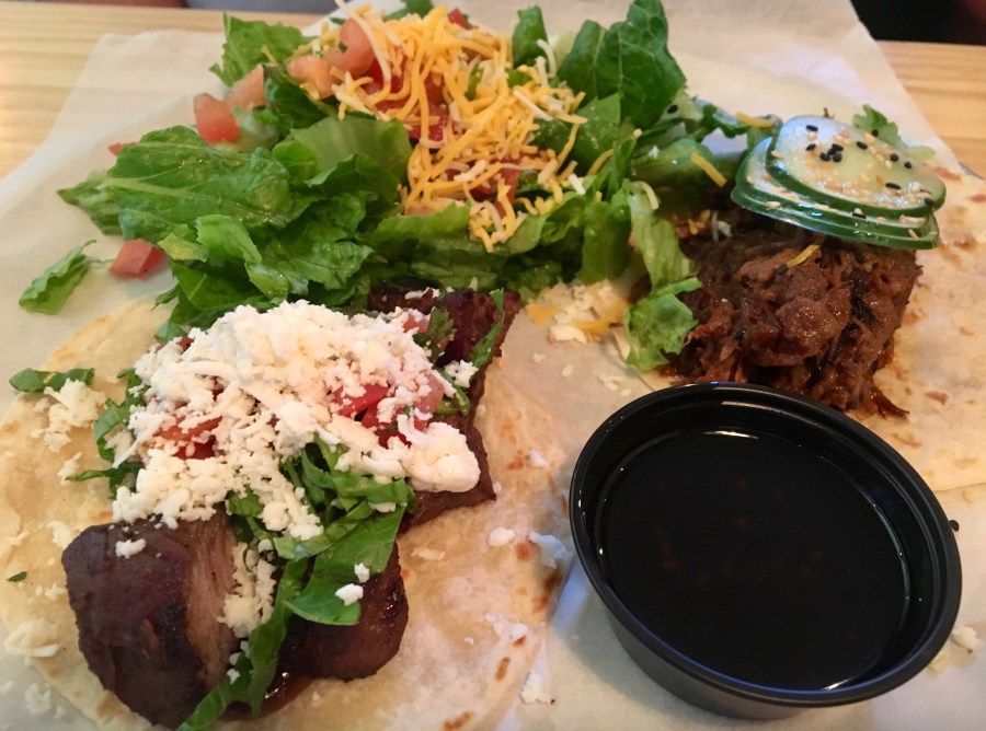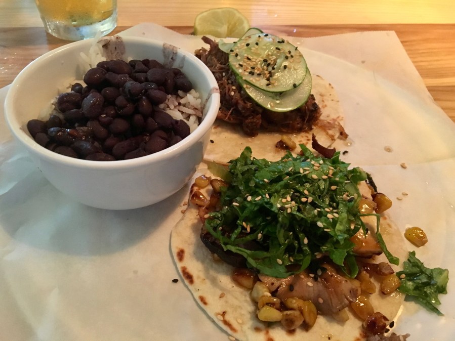Taqueria’s menu is mainly an exercise in Asian-Latin fusion. Tacos, of course, are dominant, but you can get them filled with Asian-inspired Thai chicken or shrimp tempura. Or, you can get a salad.