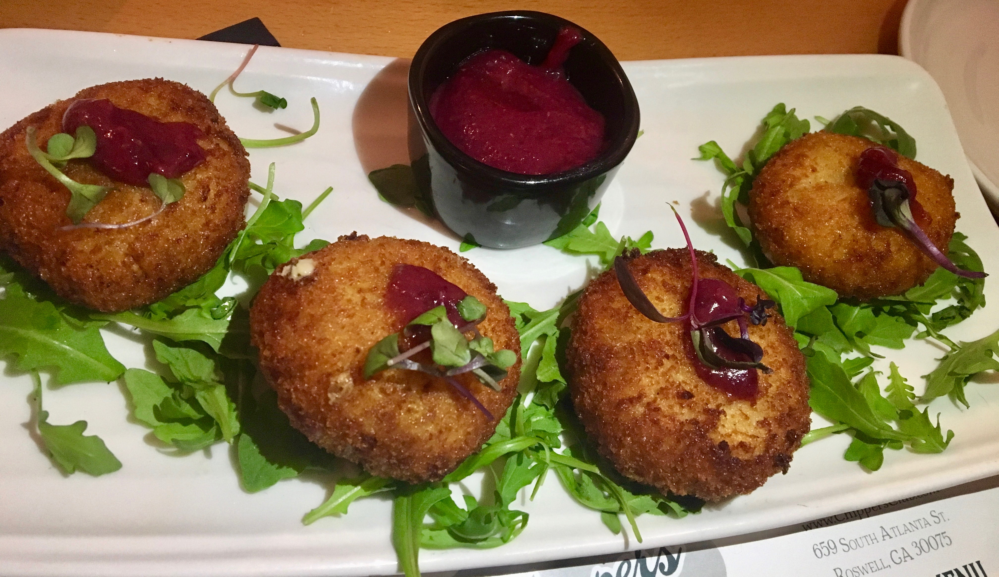 Three of the four beers are brewed a few blocks away at Gate City Brewing. The best description of the fare is “trendy Southern”. We ask our server what’s a good appetizer for the table and she suggests we try the cranberry goat cheese fritters.